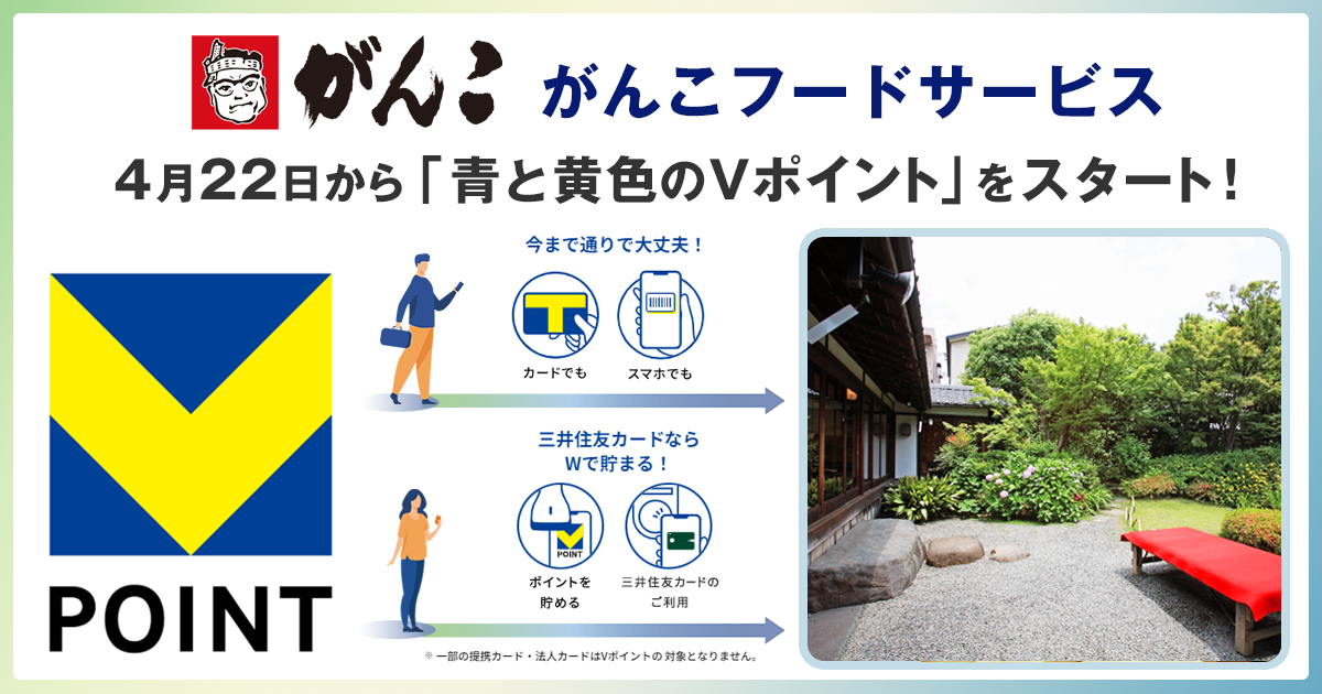 このたびの取り組みにより、「がんこ」店舗をご利用のお客さまは、店頭でのお会計時に、「青と黄色のVポイント」が貯まるカードを提示すると、ショッピングポイントとして「青と黄色のVポイント」が200円で1ポイント貯まります。さらに三井住友カード※でお支払いすると、決済ポイントとして「青と黄色のVポイント」が併せて貯まります。