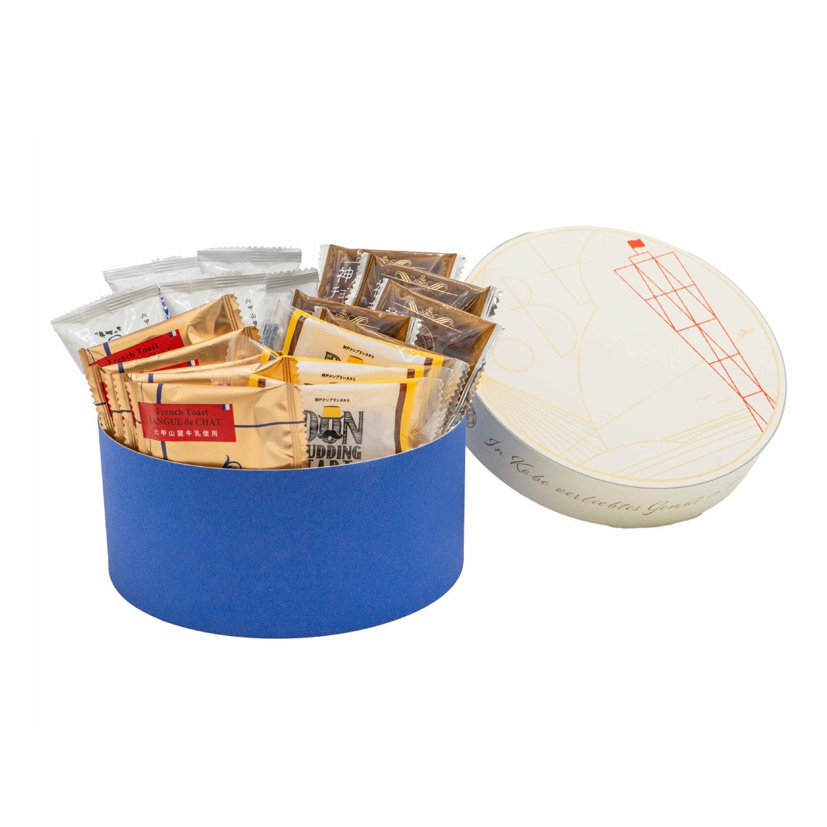 「神戸三宮フレンチトーストラングドシャ5枚」「神戸ミルクチョコラングドシャ5枚」「神戸ミルクヨーグルトパフェクッキー5個」「神戸ドン・プリン・タルト3個」を詰め合わせました。神戸をモチーフにした丸箱に詰め合わせたアソートBOXです。