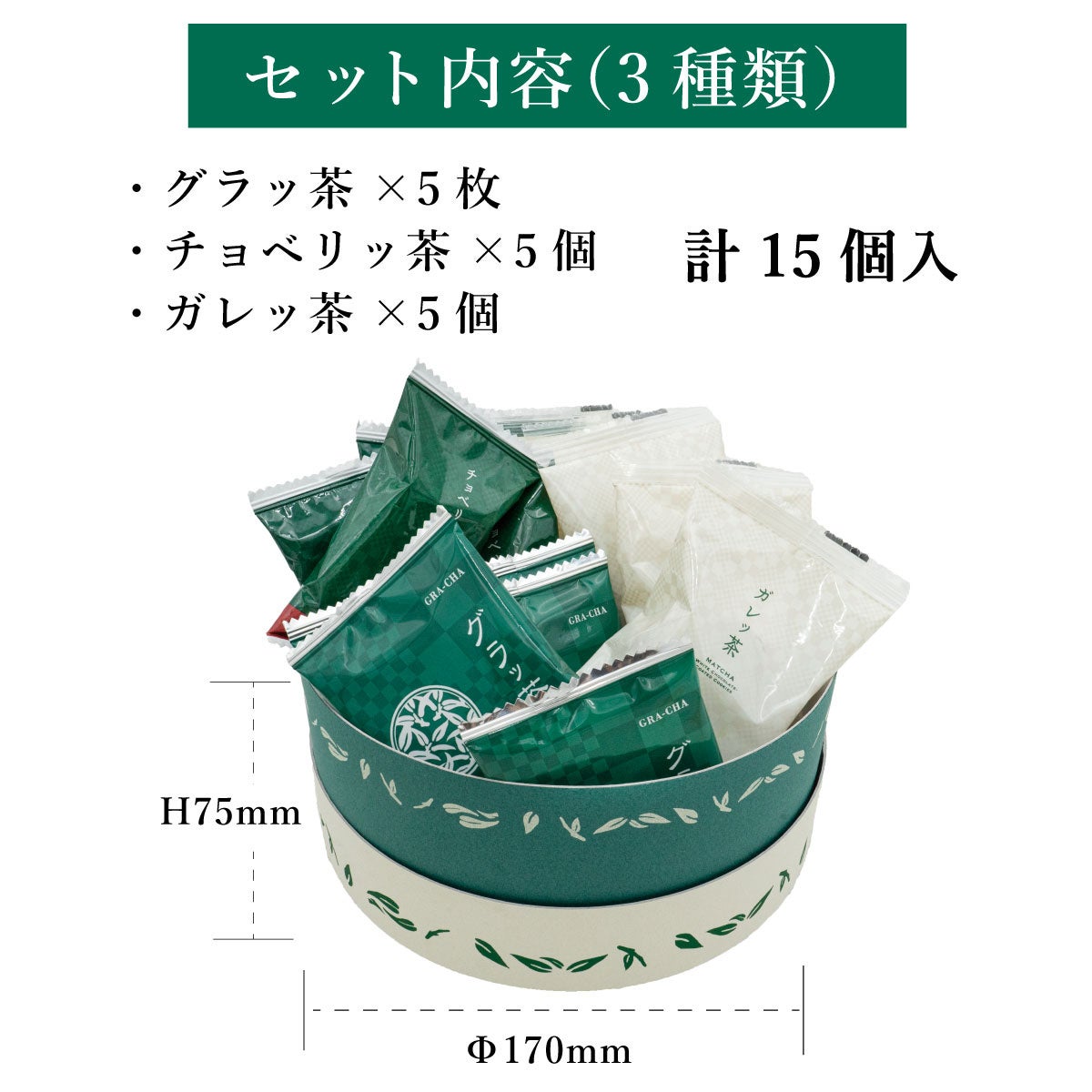 抹茶と相性の良い素材を組み合わせた3種類の焼き菓子、「グラッ茶」「チョベリッ茶」「ガレッ茶」が合計15個入っていて、それぞれのお味をお楽しみいただけます。