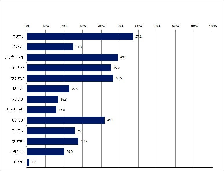 「カリカリ(57.1%)」が1位となり、2位「シャキシャキ(49%)」、3位「サクサク(46.5%)」と続き、