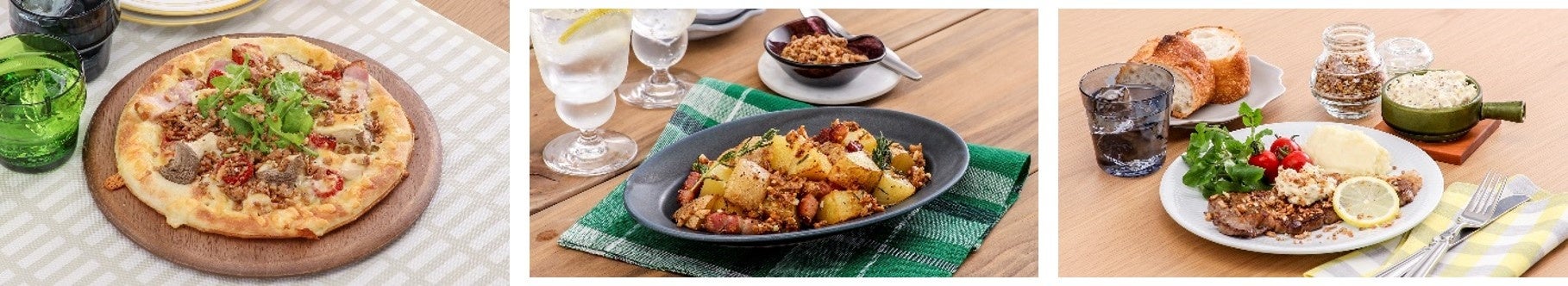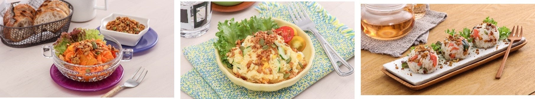 日本人が好きな4種類のナッツを厳選。食感、見た目にこだわり、料理を引き立てるよう、粒を食べやすいように砕き、軽くスパイスで味をつけました。
