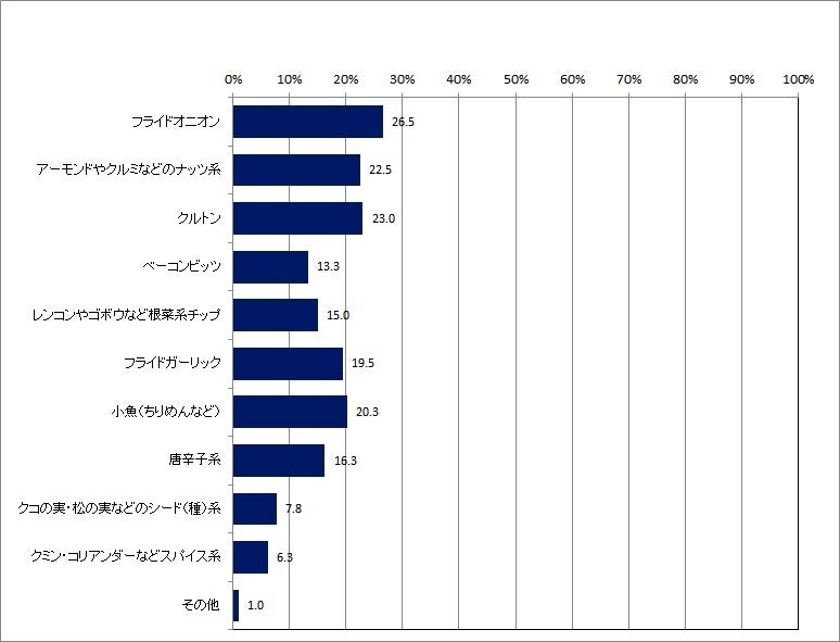 「フライドオニオン(26.5%)」、「クルトン(23.0%)」「アーモンドやクルミなどのナッツ系