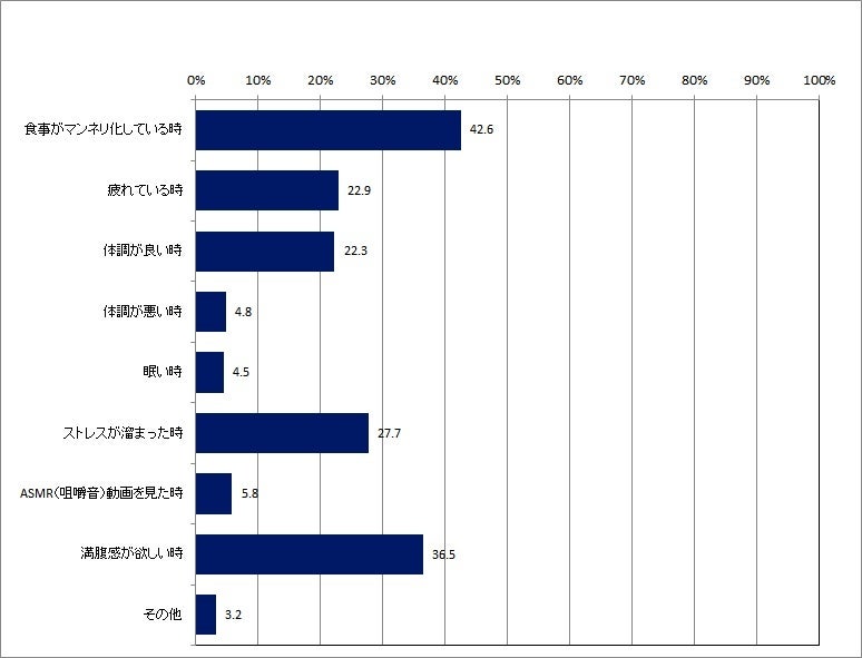 「食事がマンネリ化している時(42.6%)」、「満腹感が欲しい時(36.5%)」に続く、