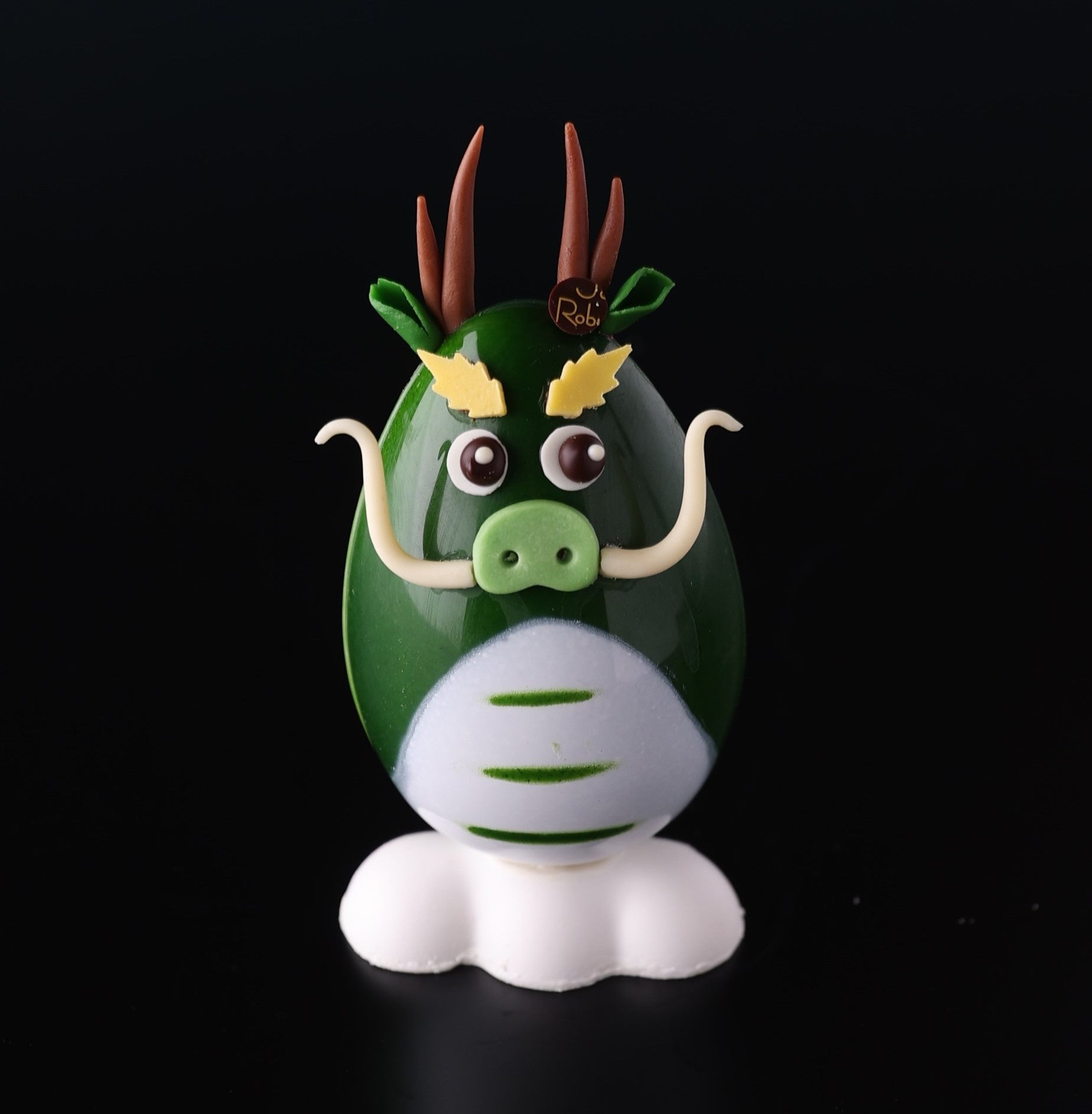 商品詳細:今年の干支「辰」を、雲に見立てたホワイトチョコレートに乗せてコミカルに表現しました。耳やひげ、尻尾もすべてチョコレートでできています。