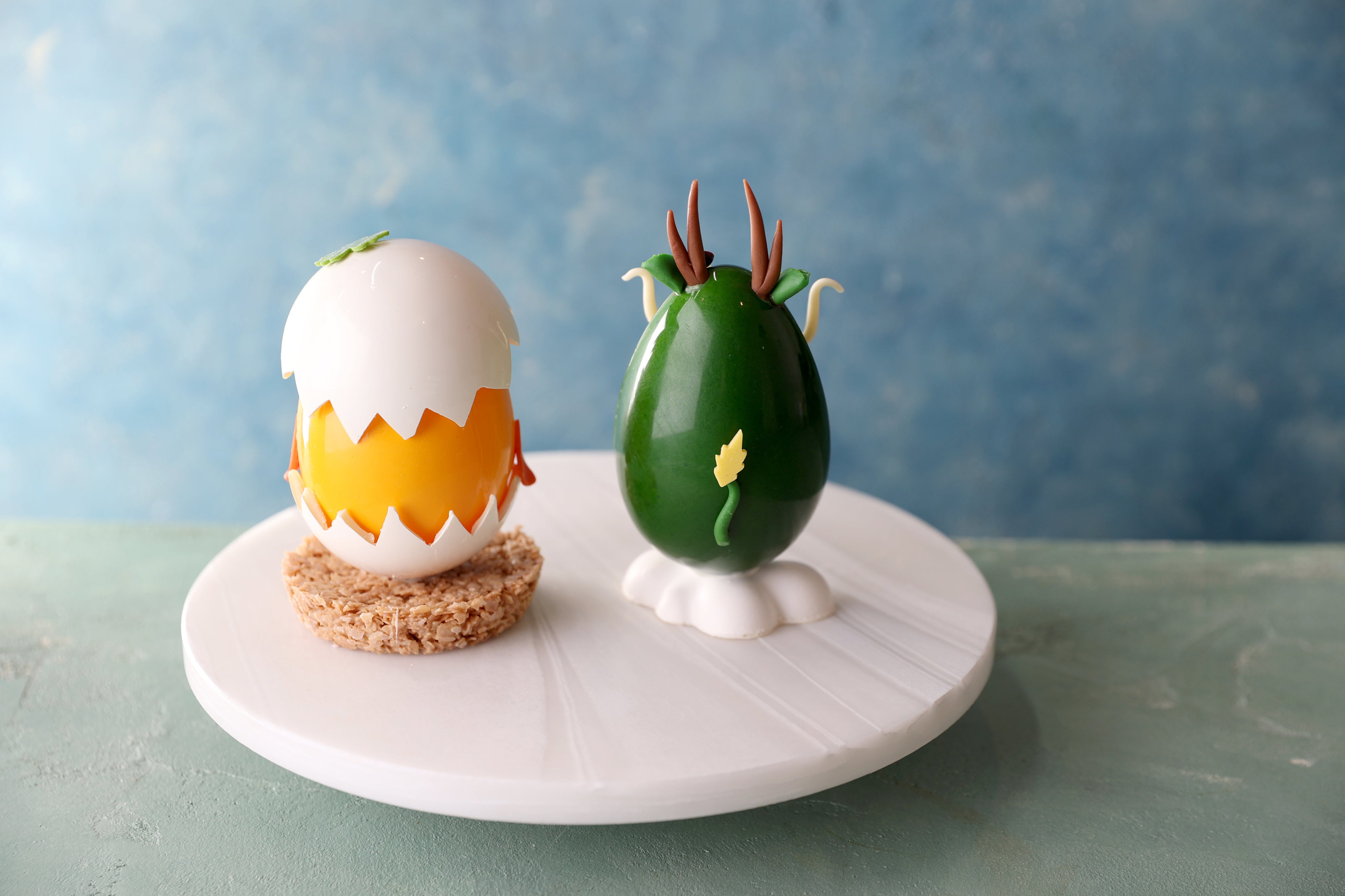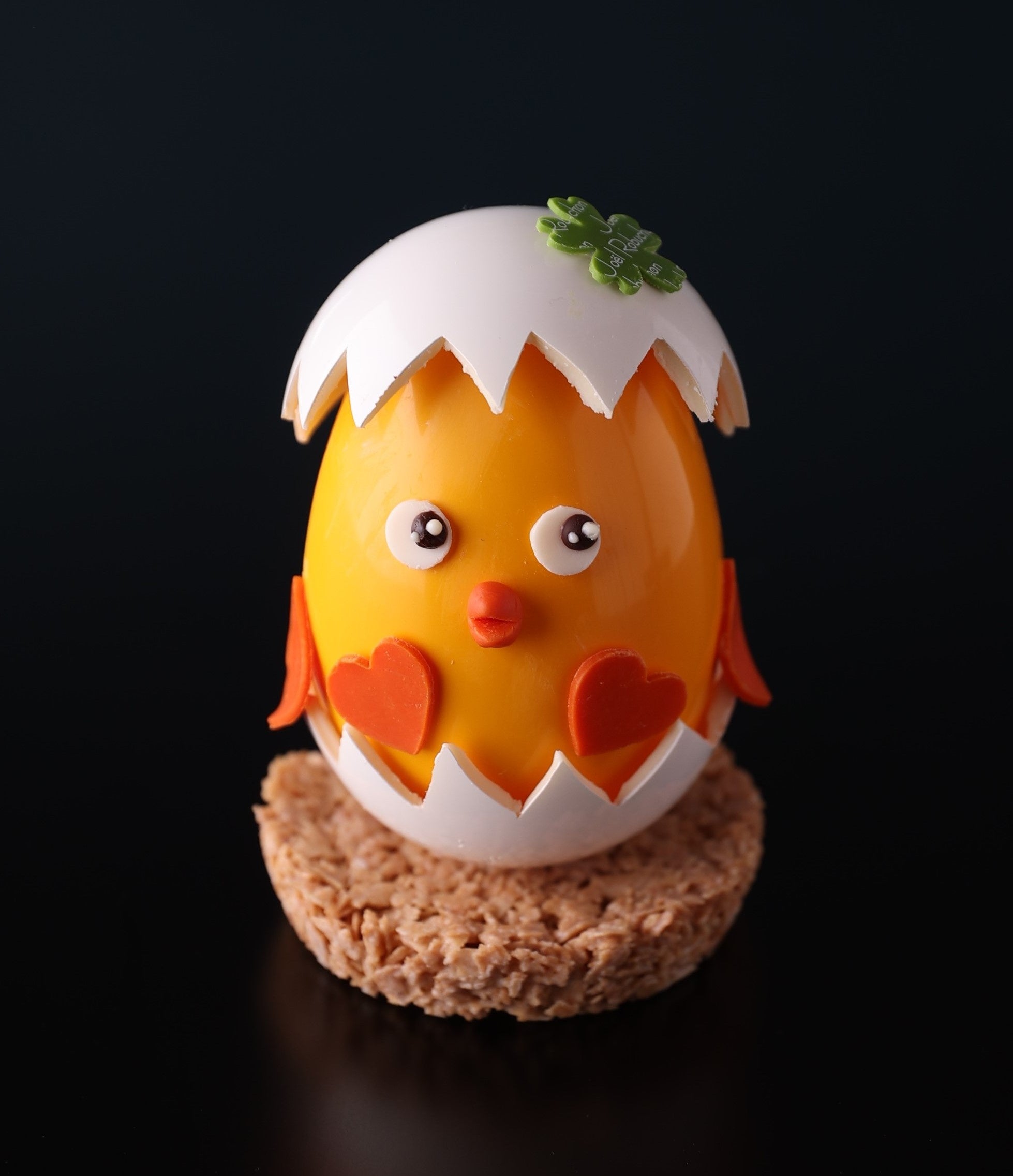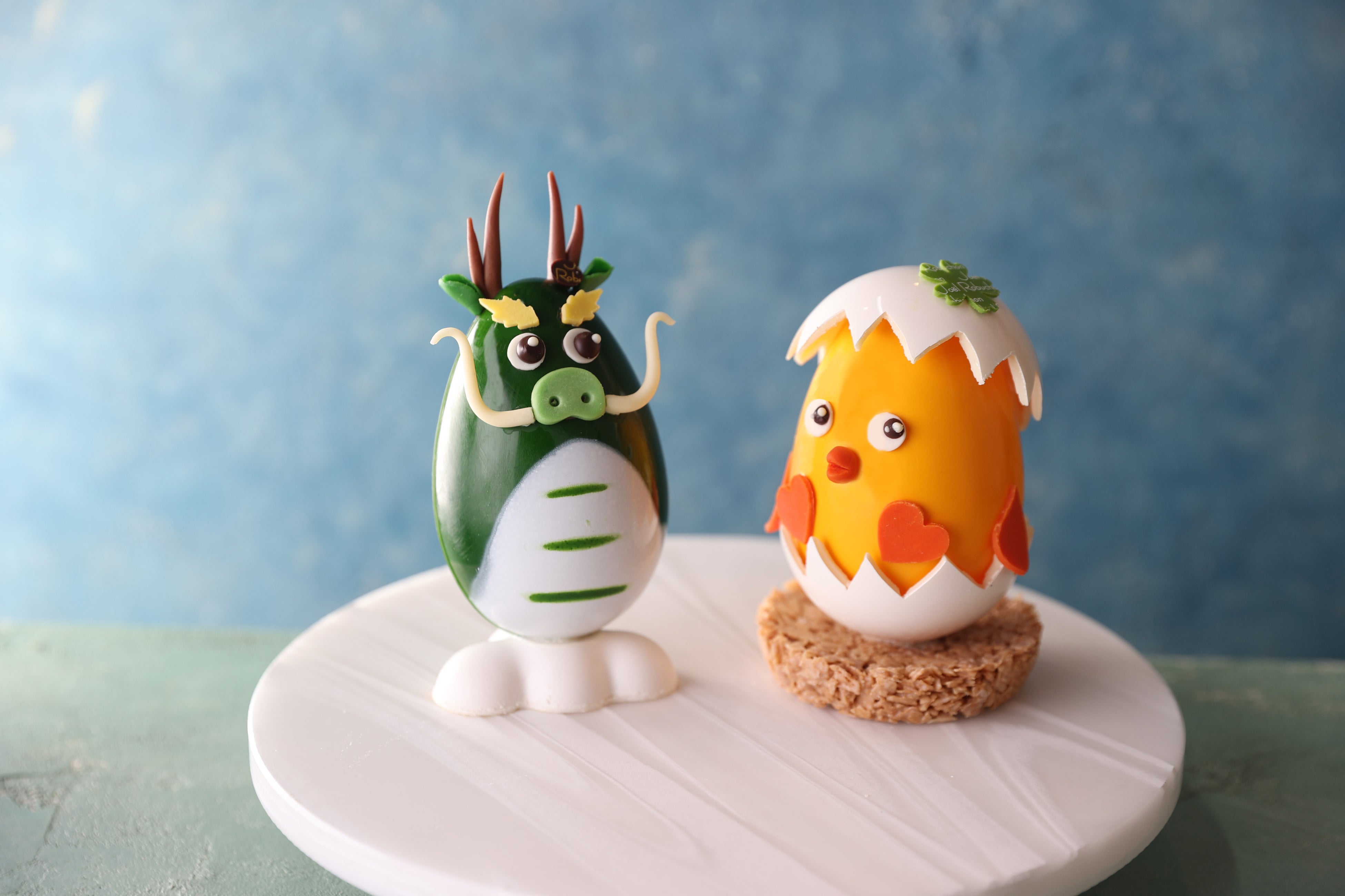 どちらも本体はホワイトチョコレート、 「辰」が乗っている雲に見立てた土台はホワイトチョコレート、「ひよこ」の土台はさくさくとした食感のホワイトチョコレートのロッシェで出来ており、全て余すことなくお召上がりいただけます。また、本体の中にはヴァローナ社のチョコレートでアーモンドをコーティングした「アマンドショコラ」が入っており、見た目だけでなく、様々な食感や味わいをお楽しみいただけます。