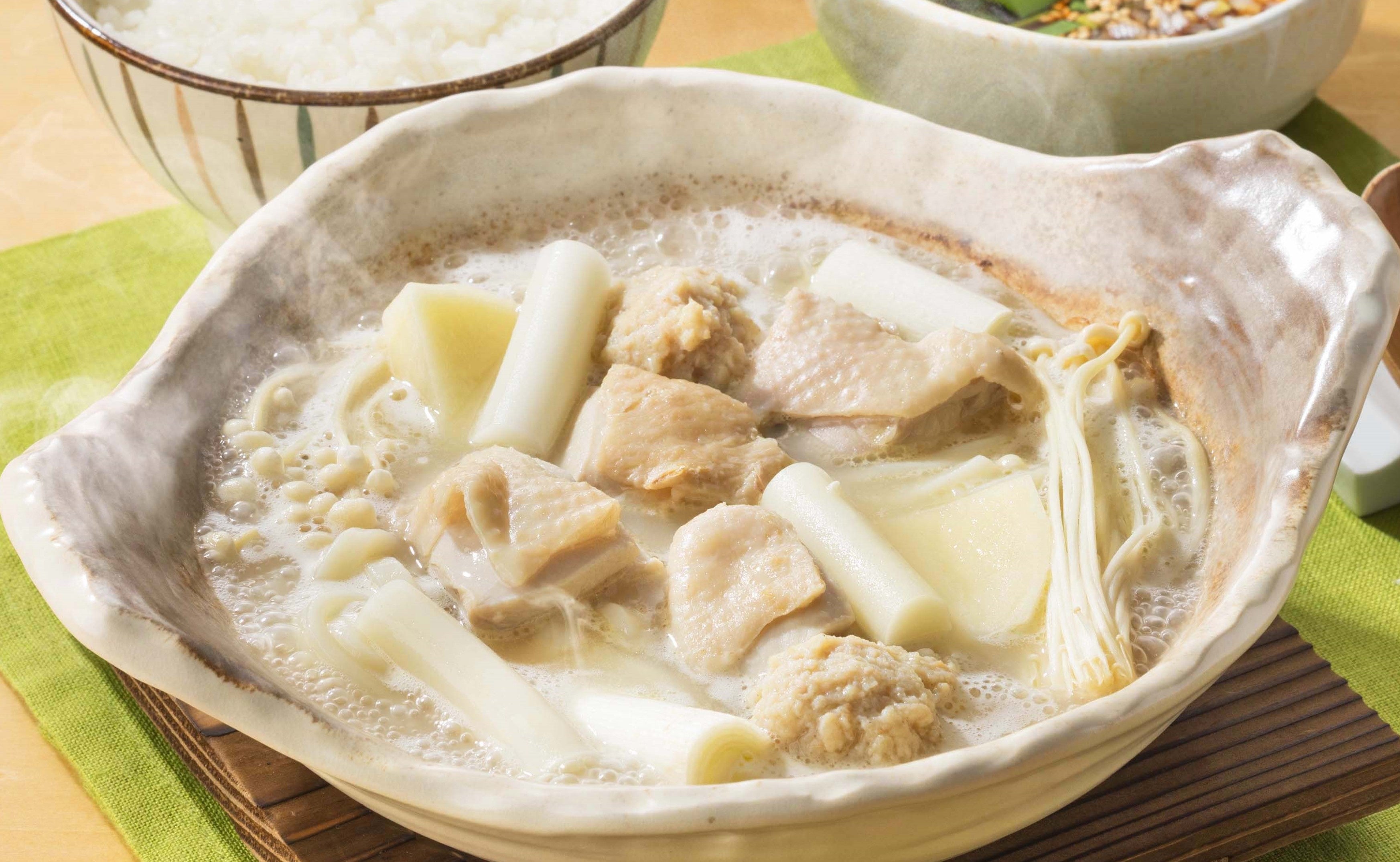 日本でも専門店があるほど人気の韓国料理を、ご飯に合う土鍋スタイルにアレンジ。鶏もも・じゃがいも・トッポギ・うどん・ネギなどを塩麹白湯スープで煮込みました。 酸味の効いた特製ピリ辛だれで味の変化もお楽しみいただけます。最後のスープまで味わえる土鍋をご堪能ください。