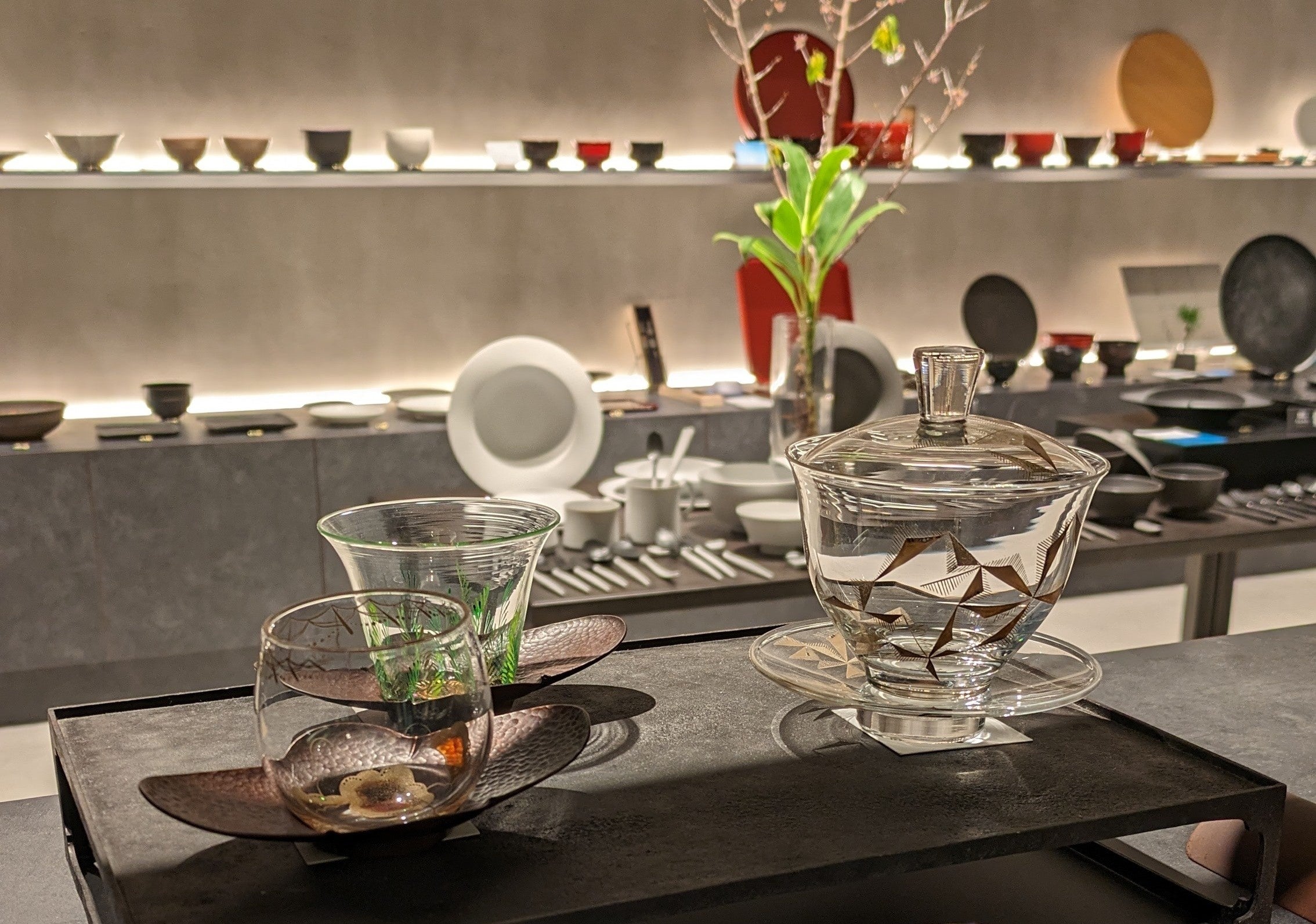 通常、漆芸はその輝きを強調するために漆黒の塗面に施されますが、透明なガラスに線や絵柄を漆で手描きする蒔絵作家。ガラスの透明感と軽やかな蒔絵や螺鈿が、漆工芸の新たな魅力の一面を際立たせます。
