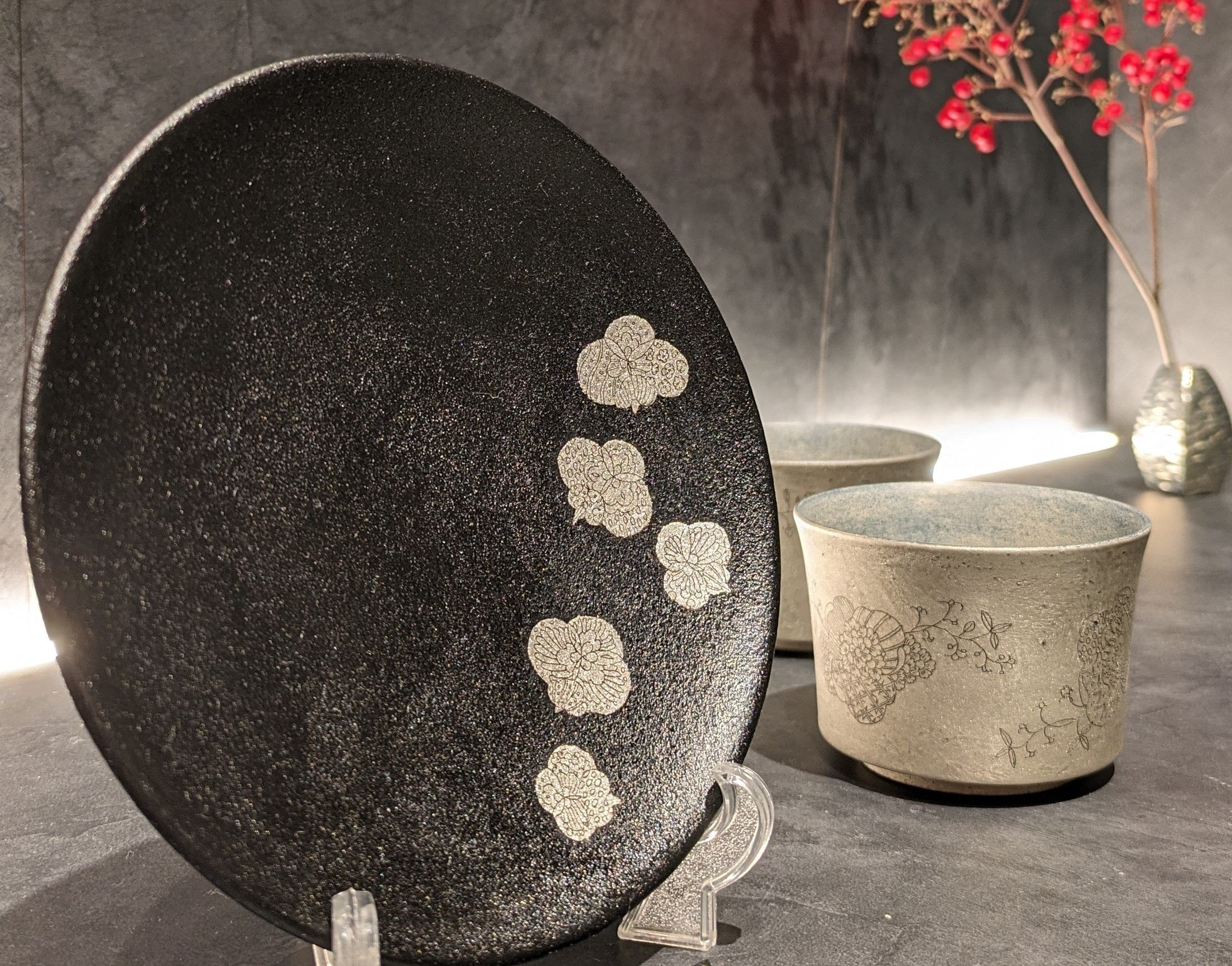 漆を塗った面に錫粉を蒔き、乾かないうちに針で文様を描く蒔絵の技法の一つ、「針描き」で作品を制作している蒔絵作家。架空の植物をモチーフにした食器やオブジェは、やさしい雰囲気だけでなく、繊細さと美しさが同居しています。