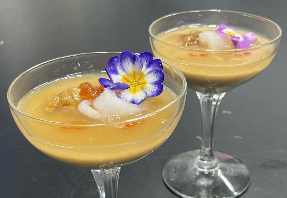 「ウニムース」の開発に尽力いただき、5店舗に参加いただいたぎんりんグループでは、豆乳とお出汁を合わせたウニムースに、白いか、いくら、県産エディブルフラワーを添えた「鳥取ウニムースと白いかのマリアージュ」、うなぎ料理店では、ウニとアカモクの茶碗蒸しでサザエご飯を包んだ「鳥取ウニとアカモク、栄螺磯飯の玉締め」、寿司店では、濃厚なウニムースの周りを白イカで巻いて灯台に例えた「鳥取ウニと白イカの灯台」、イタリア料理店では、ドギ(日本海で漁獲される深海魚)とジャガイモのテリーヌにウニを混ぜ込んで固めた「鳥取ウニとドギ、ジャガイモのテリーヌ」など、いずれも見た目を美しく、趣向を凝らした15種類の料理がお目見えしました。