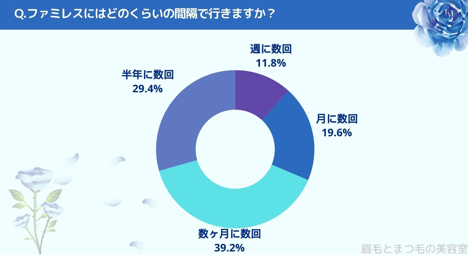 ファミレスに行く間隔をお聞きしたところ「週に数回(11.8%)」、「月に数回(19.6%)」、「数ヶ月に数回(39.2%)」、「半年に数回(29.4%)」という結果になりました。