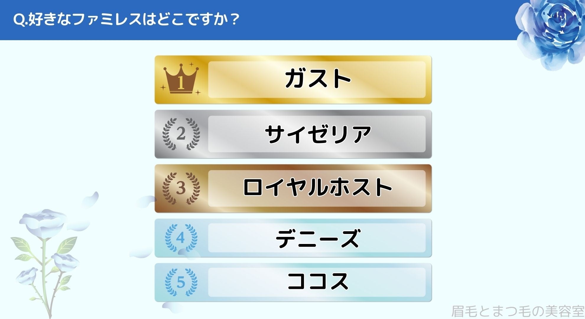 好きなファミレスをお聞きしたところ「1位>ガスト」、「2位>サイゼリア」、「3位>ロイヤルホスト」、「4位>デニーズ」、「5位>ココス」という結果になりました。