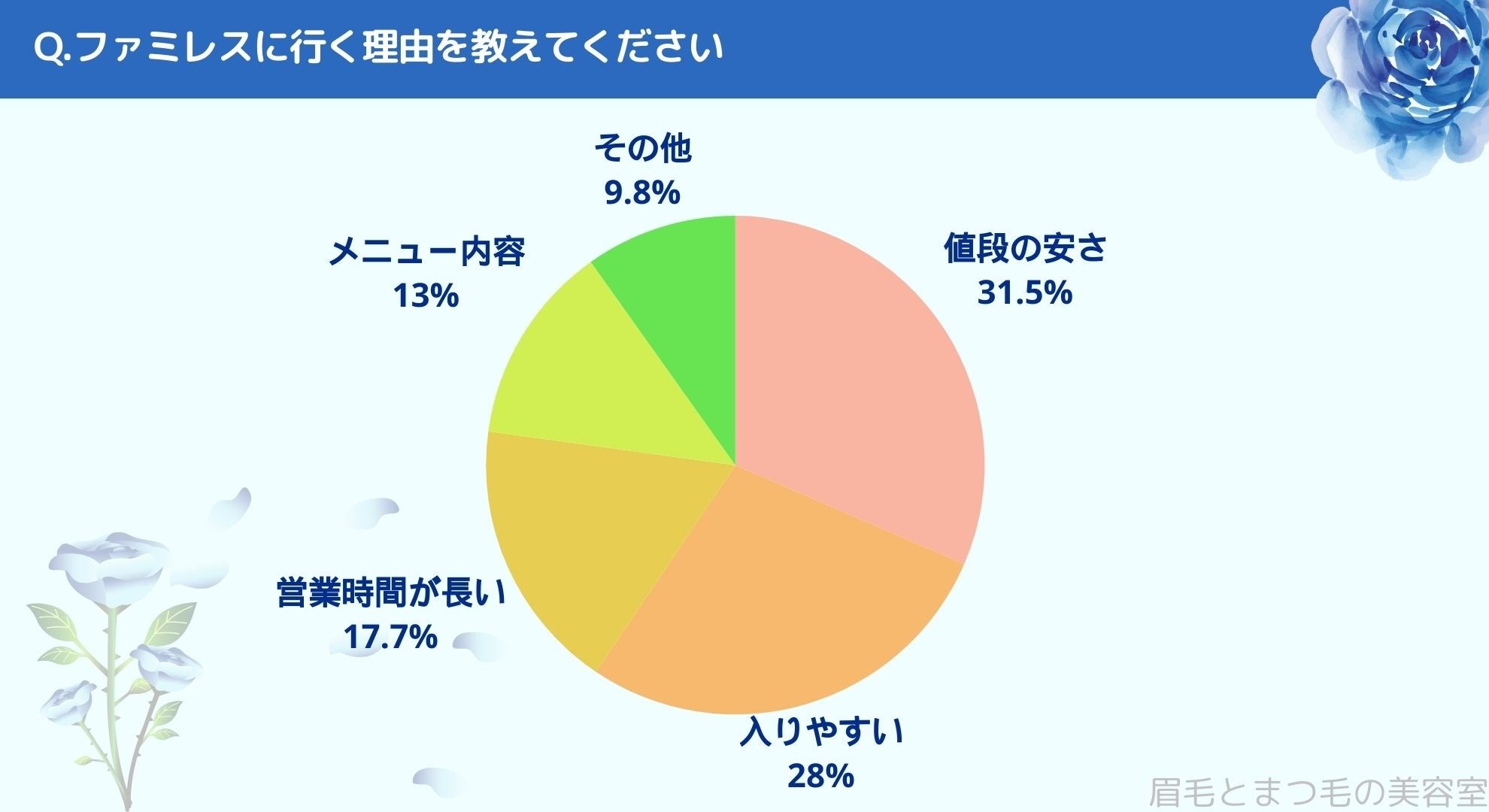 ファミレスに行く理由をお聞きしたところ「値段の安さ(31.5%)」、「入りやすい(28%)」、「営業時間が長い(17.7%)」、「メニュー内容(13%)」。「その他(9.8%)」という結果になりました。