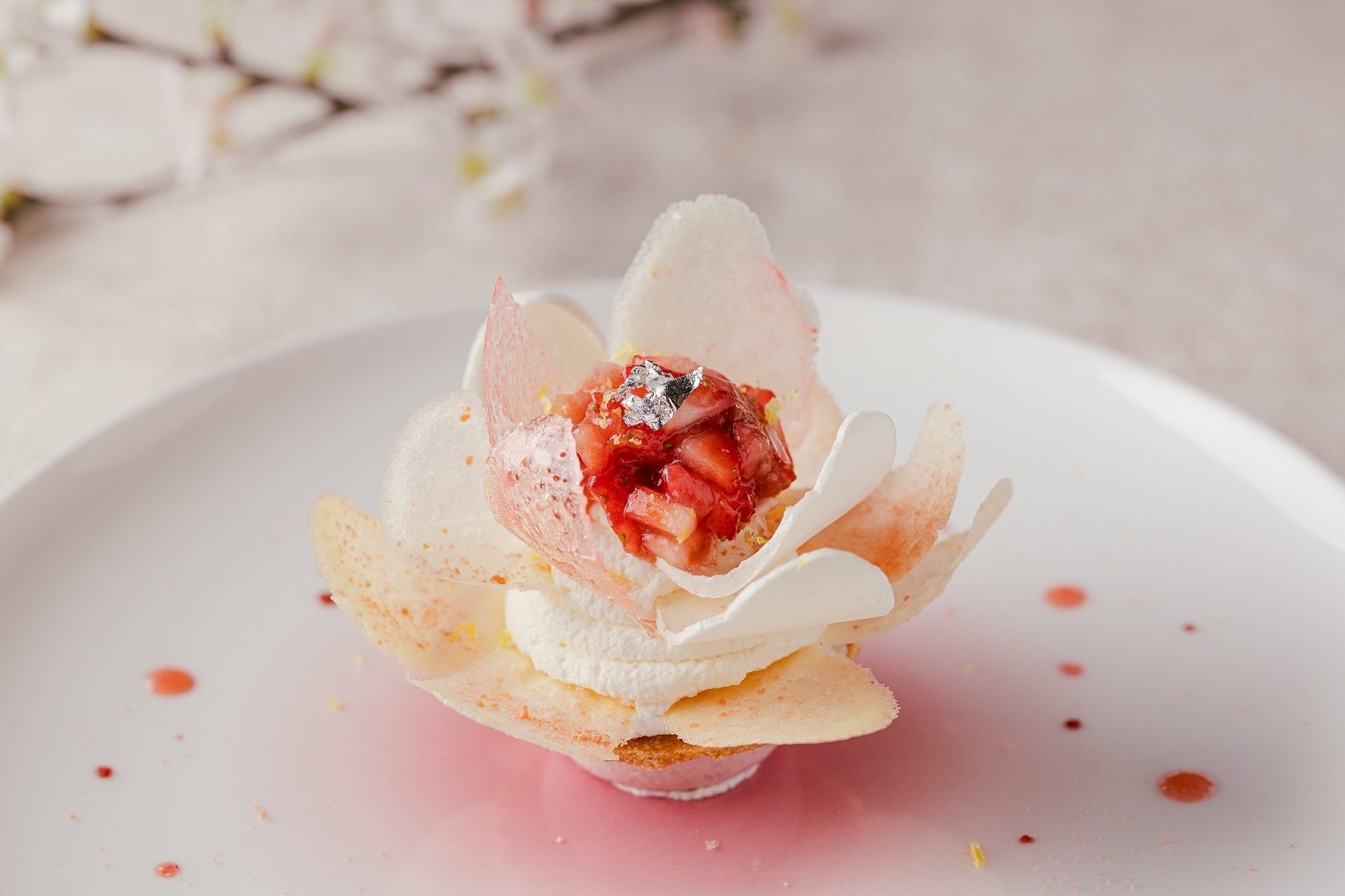 「Menu Sakura」の最後を彩るにふさわしい春を感じるフラワーモチーフのデザート。旬の苺と甘酸っぱいリュバーブのパルフェにフロマージュブランのムースを重ねました。チュイールでできた繊細な花びらの中心には苺とリュバーブのマリネで華やかさをプラスしています。
