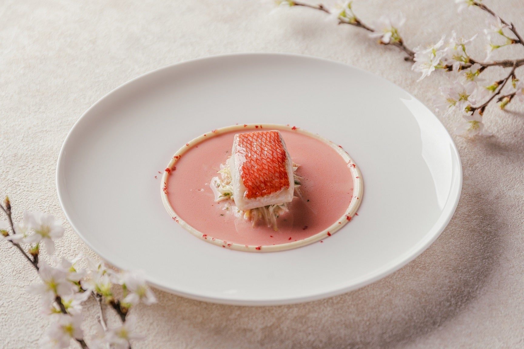 金目鯛をしっとりと蒸し上げ、旬のおいしさを最大限に引き出したシンプルな一皿です。金目鯛の下には、細く刻んで桜のオイルと和えたフレッシュのホワイトアスパラガスを。シャンパーニュを贅沢に使用した桜色のソースでお召し上がりください。