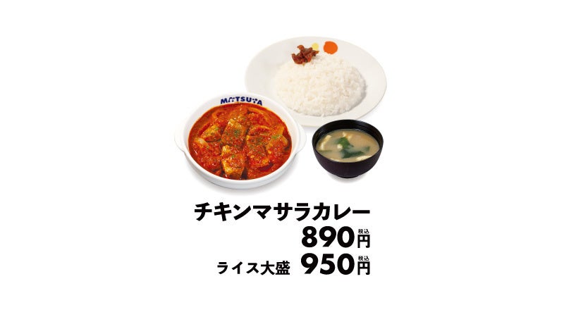 商品名 チキンマサラカレー 890円 チキンマサラカレー(ライス大盛) 950円 【弁当まとめ買い】 チキンマサラカレー弁当2個セット≪100円お得≫ 1,680円 チキンマサラカレー弁当3個セット≪150円お得≫ 2,520円 ※お持ち帰りいただけます。お持ち帰りにみそ汁は付きません。 お持ち帰りの場合、みそ汁は別途60円でお求めいただけます。 ※税込み価格です。 ※株主優待券は上記全てのメニューにご使用いただけます。 発売日 2024年3月5日(火)午前10時 ~ 対象店舗 一部店舗を除く全国の松屋 |