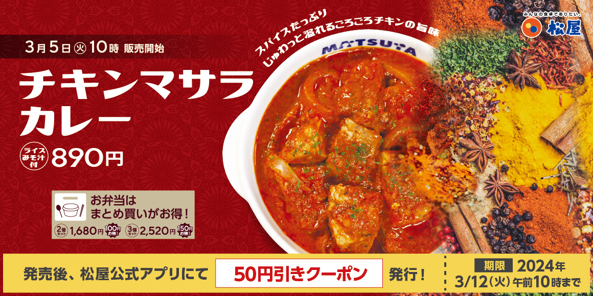 2024年3月5日(火)10時~3月12日(火)10時まで、松弁ネット・松屋モバイルオーダーにてご利用いただける「チキンマサラカレー」の50円引きモバイルクーポンを「松屋フーズ公式アプリ」にて配信いたします。
