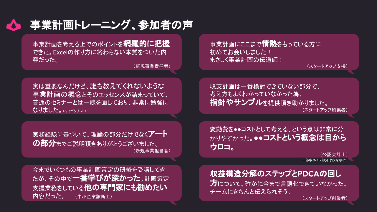 研修においては、ファイナンス、新規事業、事業計画に関するものを提供しており、「大手企業の新規事業担当者向け ”よい”事業計画のつくり方」は、264社が受講。特に大手企業の新規事業担当者のお悩みに最も多い「事業計画の作成方法」について思考法やノウハウを提供しています。