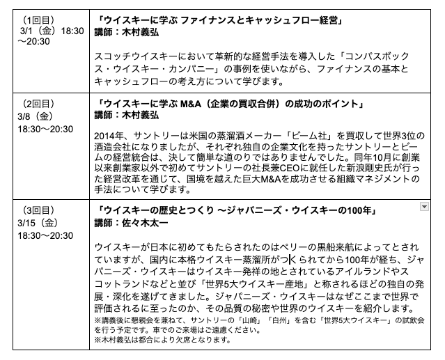 ウイスキービジネスに代表される、「時間」を活用して収益を上げるための経営ノウハウは「ファイナンス」と呼ばれます。この講座では、ファイナンスというものに触れたことがない方にも分かりやすくその意味や活用法を伝授されます。また、最終回には「マスター・オブ・ウイスキー」の称号を持つサントリーの佐々木太一氏(元バレー日本代表)をお招きしてのウイスキーの歴史と品質についてのミニ講座、そして世界の5大ウイスキーの試飲を兼ねた懇親会が開催されます。