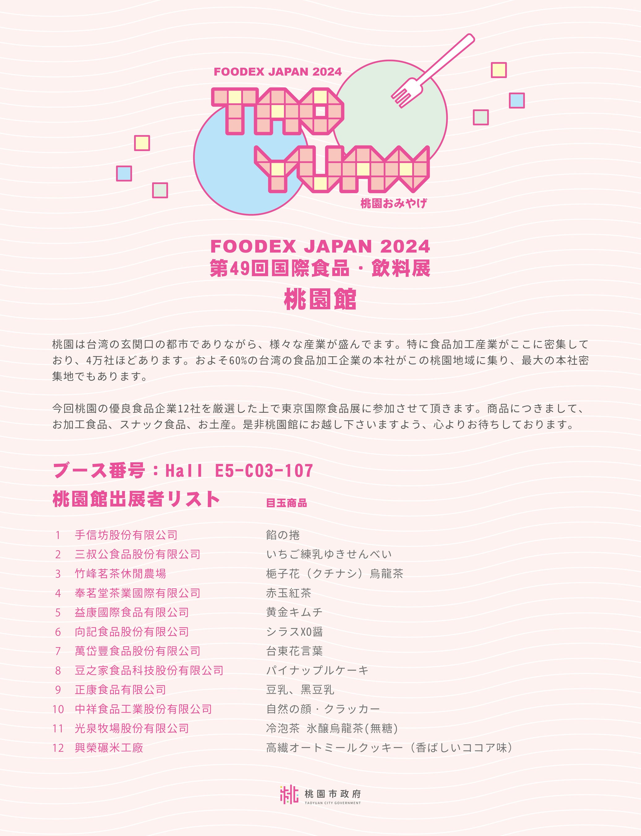 桃園市政府の経済発展局は、食品安全に対する桃園の取り組みを重視しており、厳格な品質管理を通じて商品を推進しています。これらの商品は、桃園と世界各国との友好関係を築く架け橋として役立ち、国際的な市場へのアクセスを拡大しています。3月5日から8日まで、国際バイヤーや販売業者は、桃園の地元食品の力を体験するために、ぜひ東京ビッグサイトの台湾館(ブース番号E5-C03-107)までお越しください。