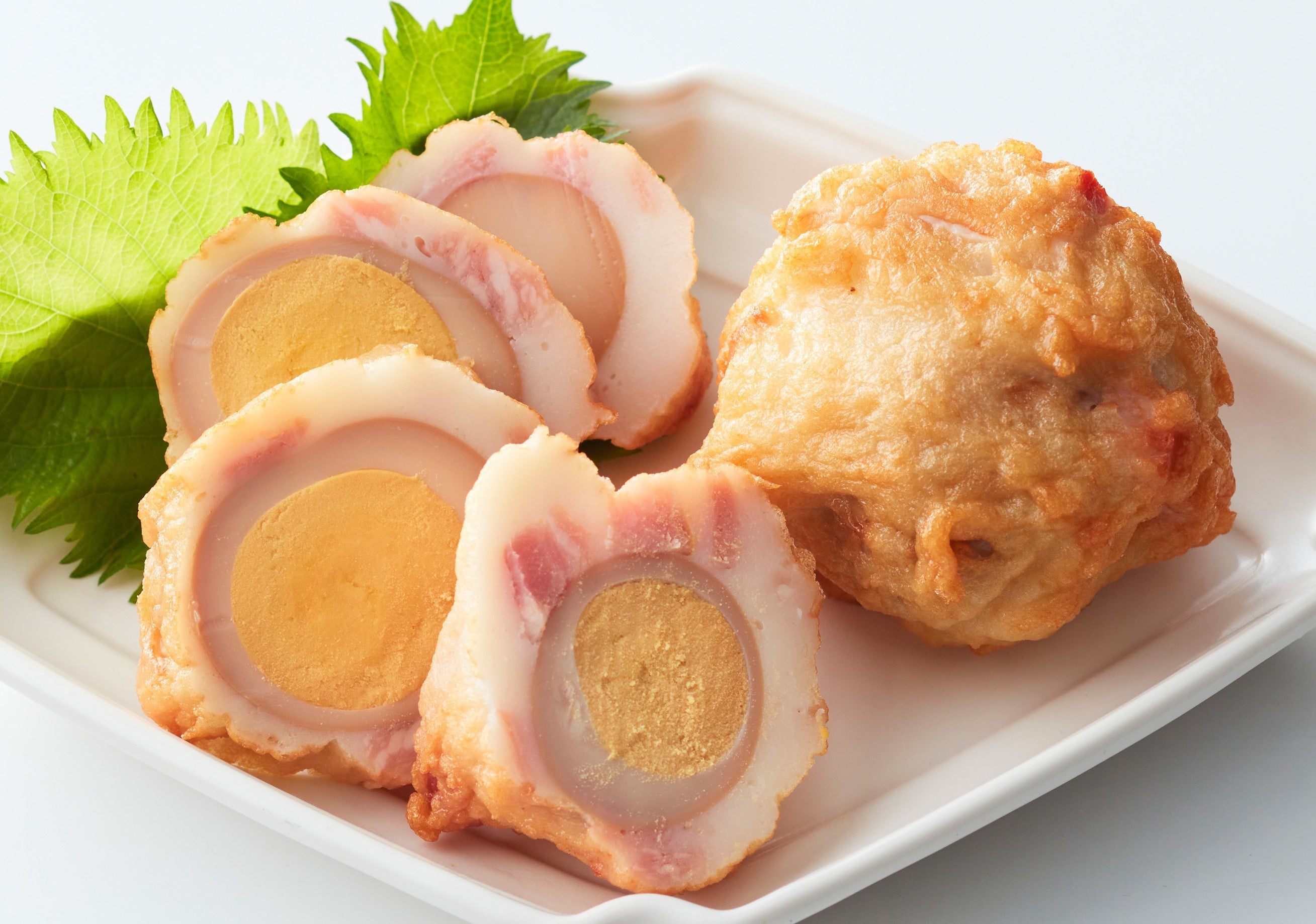 すり身に混ぜた角切りベーコンとゆでたまごで、和製ベーコンエッグに!