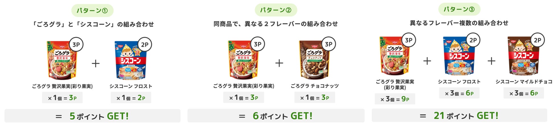 ①対象商品を購入したレシートを撮影して、登録することでポイントが貯まります。貯まったポイントで賞品に応募できます。(ごろグラ1個=3ポイント、シスコーン1個=2ポイント)