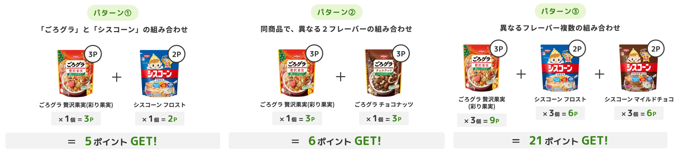 ①対象商品を購入したレシートを撮影して、登録することでポイントが貯まります。貯まったポイントで賞品に応募できます。(ごろグラ1個=3ポイント、シスコーン1個=2ポイント)