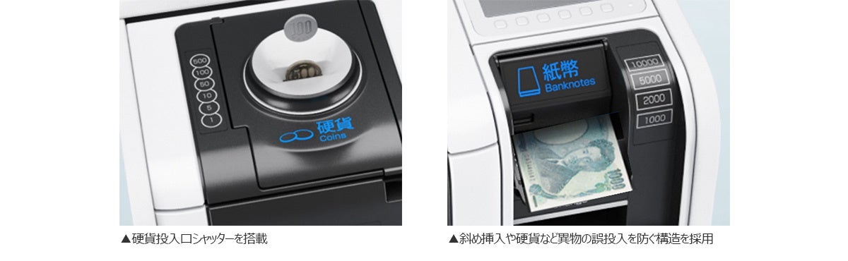 硬貨の大量投入によるレジ休止を削減するため、硬貨入金時に特定の枚数(※3)を超えると、入金を受け付けず排除する機能を搭載しました。また、取引中以外の硬貨投入を防止する硬貨投入口シャッターを搭載。さらに、紙幣挿入口には、紙幣の斜め挿入や硬貨など異物の誤投入を防ぐ構造を採用し、運用時のトラブルを未然に防ぎます。
