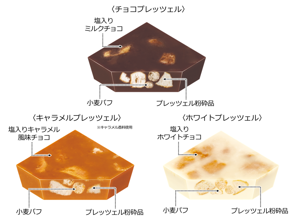 北海道産の塩入りミルクチョコ、キャラメルチョコ、ホワイトチョコに粉砕したプレッツェルと小麦パフを合わせました。チョコの甘さと塩味がクセになる絶妙なバランスで、プレッツェルの香ばしさとカリカリ食感が楽しめます。