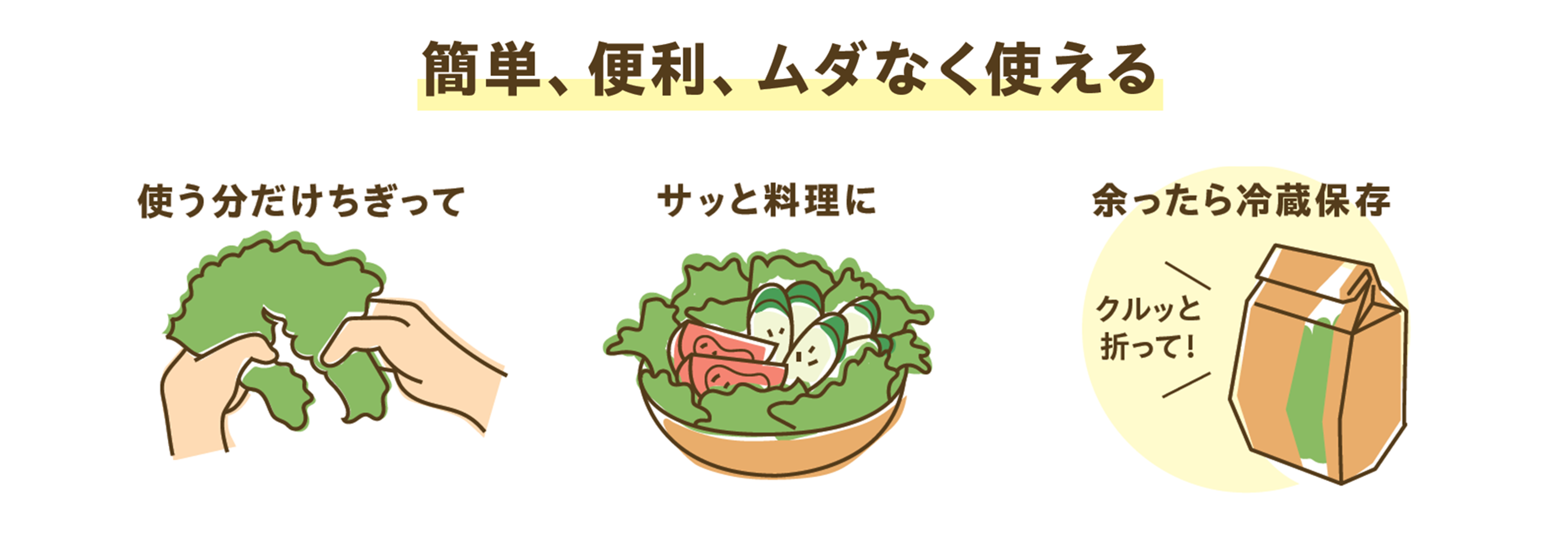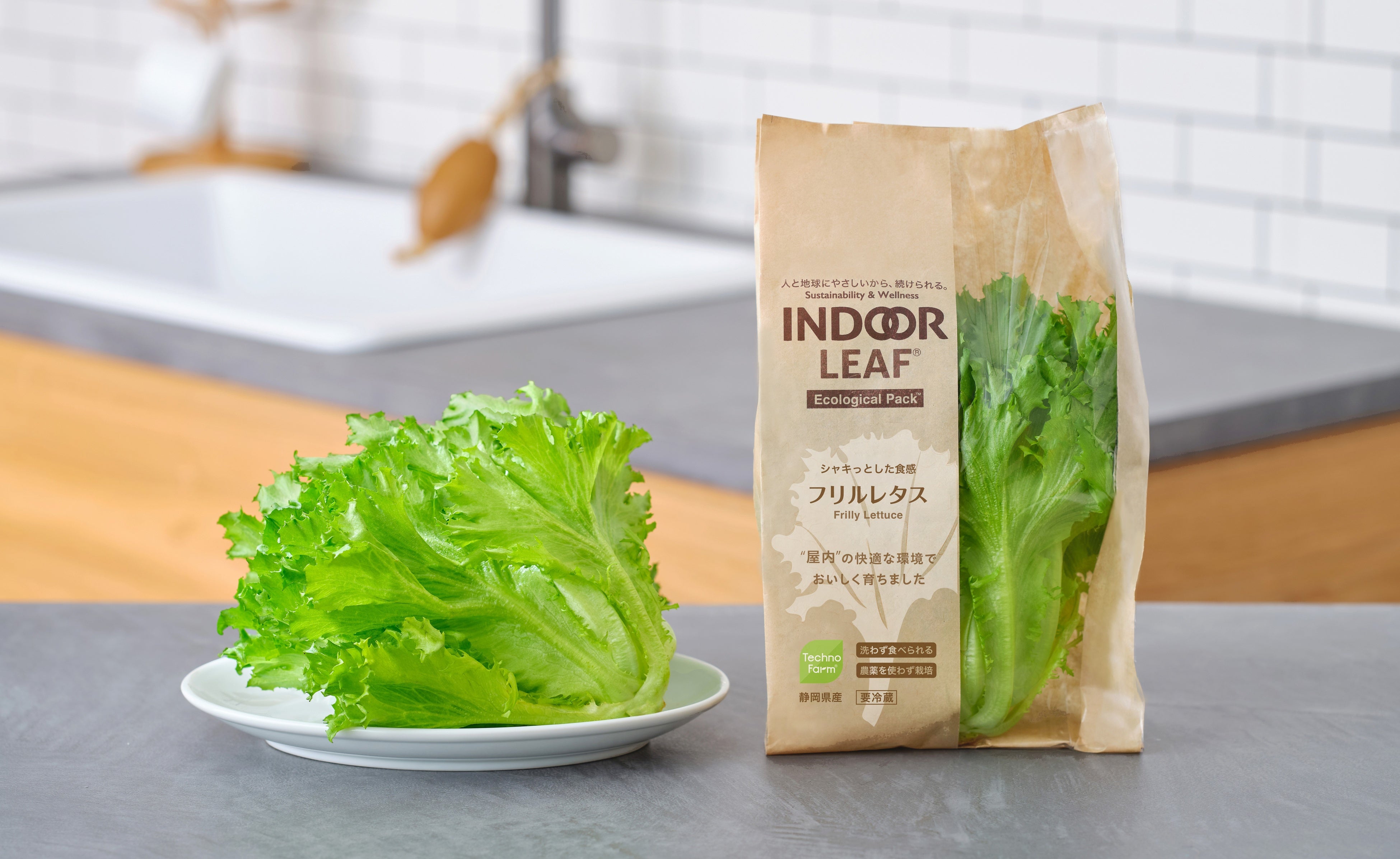 「INDOOR LEAF」は、農薬を使わずに育った200gの大きな株でお得感いっぱいのレタスです。Techno Farm自動化生産システムのクリーンな栽培環境と徹底した衛生管理※1 のもとで生産しているため、洗わずに食べられ鮮度が長持ちします。また、環境にも配慮した紙パッケージで、生活にも取り入れやすい商品です。