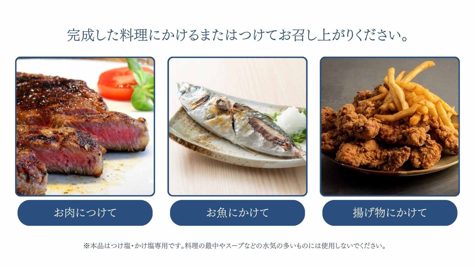 使用方法:つけ塩、かけ塩として完成した料理に使用してください