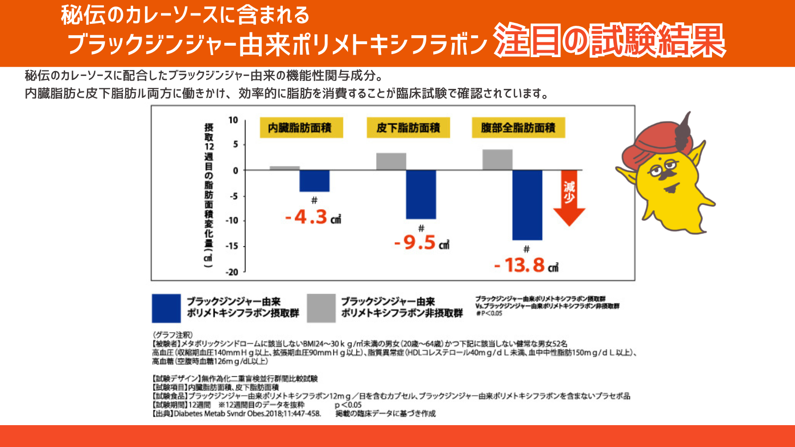 消費者庁に受理された届出表示は、「本品には、ブラックジンジャー由来ポリメトキシフラボンが含まれます。ブラックジンジャー由来ポリメトキシフラボンは、日常活動時のエネルギー代謝において脂肪を消費しやすくする作用により、BMIが高め(BMI24以上30未満)の方のおなかの脂肪(内臓脂肪、皮下脂肪)を減らす機能があることが報告されています。」