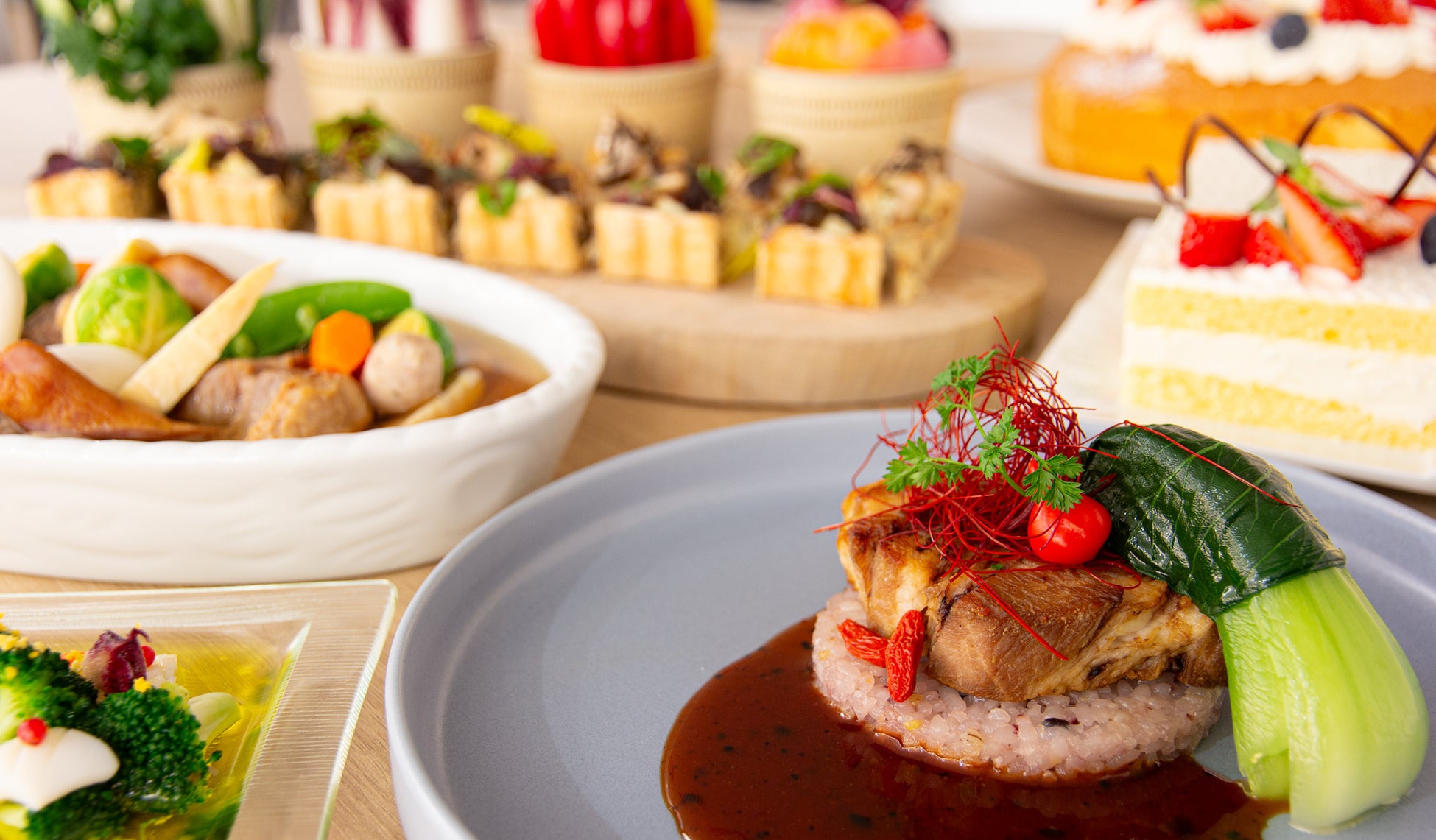 セミブッフェスタイルで楽しめる本ランチでは、3種類のメイン料理からお好みの1品をお選びいただけます。近海で水揚げされた本鰆と和だしで浸した小松菜を、柚子が香るフィルムで包み込み、鰆との相性ぴったりな大根のみぞれ餡と召し上がっていただく「本鰆と海老の柚子の香 みぞれ餡仕立て」、猟師風という意味を持つ、チキンと野菜を煮込んだ素材の旨味を楽しむイタリアの定番煮込み料理「九州産若鶏のカッチャトーラ」、ミネラルを豊富に含んだ阿蘇の名水が染み渡る水源と広大な大地でのびのびと育てられた豚の肩ロースをコンフィに仕上げ、八角の優しい香りで調理した「阿蘇自然豚肩ロースのコンフィ 八角風味」、これら3種類のメイン料理はどれもシェフが自信をもってご提供いたします。