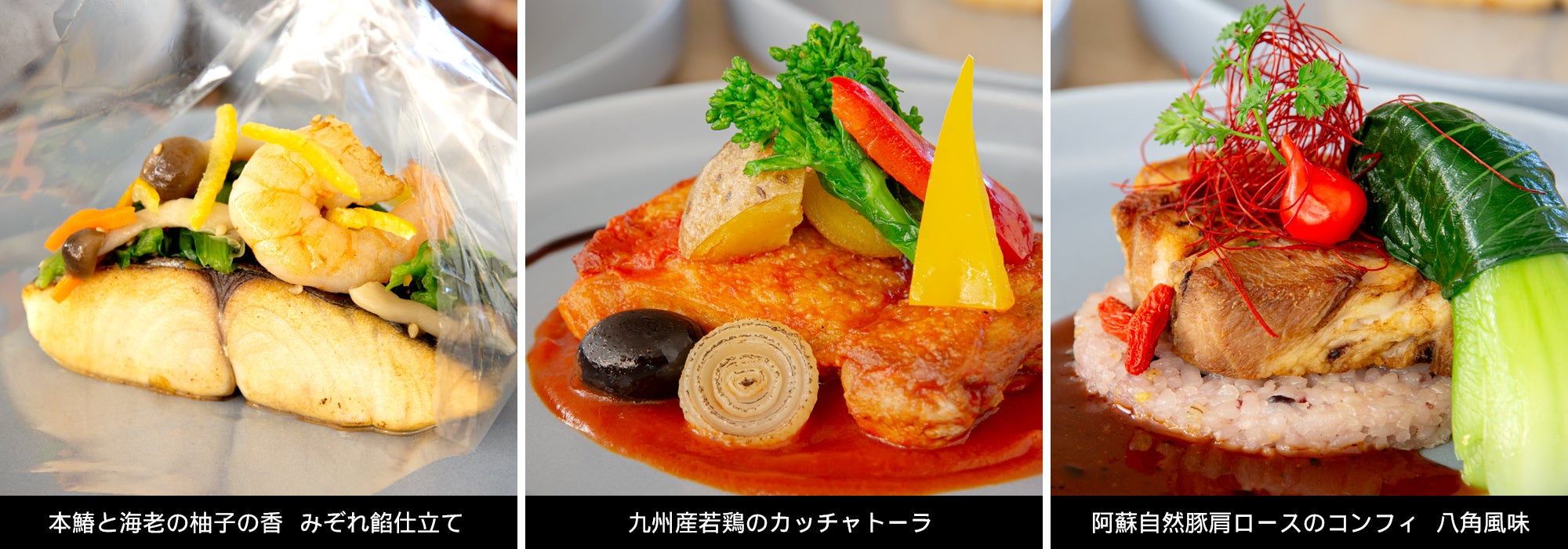 セミブッフェスタイルで楽しめる本ランチでは、3種類のメイン料理からお好みの1品をお選びいただけます。近海で水揚げされた本鰆と和だしで浸した小松菜を、柚子が香るフィルムで包み込み、鰆との相性ぴったりな大根のみぞれ餡と召し上がっていただく「本鰆と海老の柚子の香 みぞれ餡仕立て」、猟師風という意味を持つ、チキンと野菜を煮込んだ素材の旨味を楽しむイタリアの定番煮込み料理「九州産若鶏のカッチャトーラ」、ミネラルを豊富に含んだ阿蘇の名水が染み渡る水源と広大な大地でのびのびと育てられた豚の肩ロースをコンフィに仕上げ、八角の優しい香りで調理した「阿蘇自然豚肩ロースのコンフィ 八角風味」、これら3種類のメイン料理はどれもシェフが自信をもってご提供いたします。