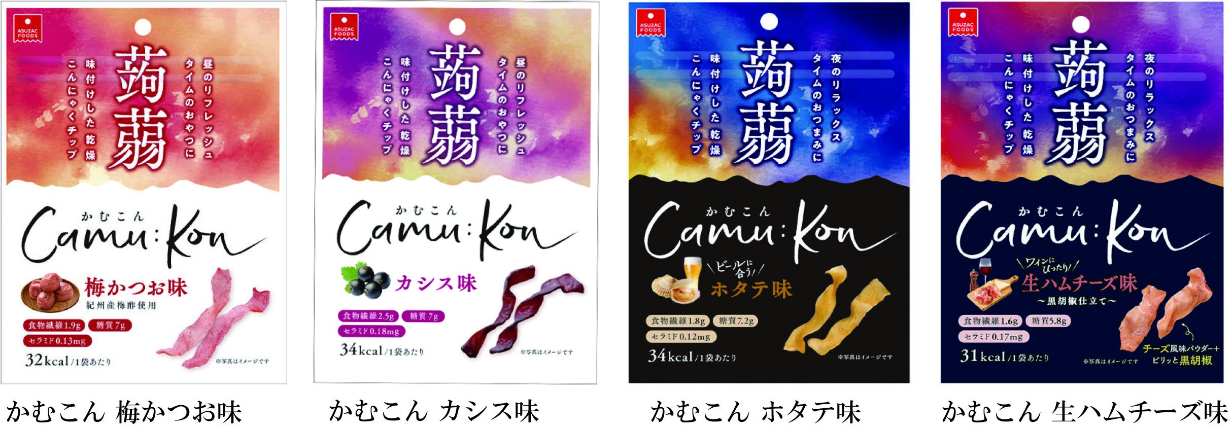 蒟蒻は単純に乾燥させるとバリバリとした食感になってしまうため、保湿性を高める原料を配合し、それぞれの味に適した食感を施す技術を用いています。