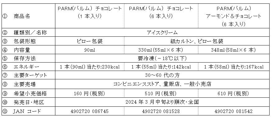 「PARM(パルム)」は、なめらかでコクのあるアイスクリームを口どけのよいチョコでコーティングしたバーアイスです。2005年の発売以来、お客さまに“日常のちょっとした贅沢”を提供してまいりました。リニューアル発売する「PARM(パルム) チョコレート(1本入り/6本入り)」、「PARM(パルム) アーモンド&チョコレート(6本入り)」いずれも、アイスのバニラ感をアップさせ、濃厚なチョコの味わいや香ばしいローストア―モンド入りチョコとの一体感を高めました。