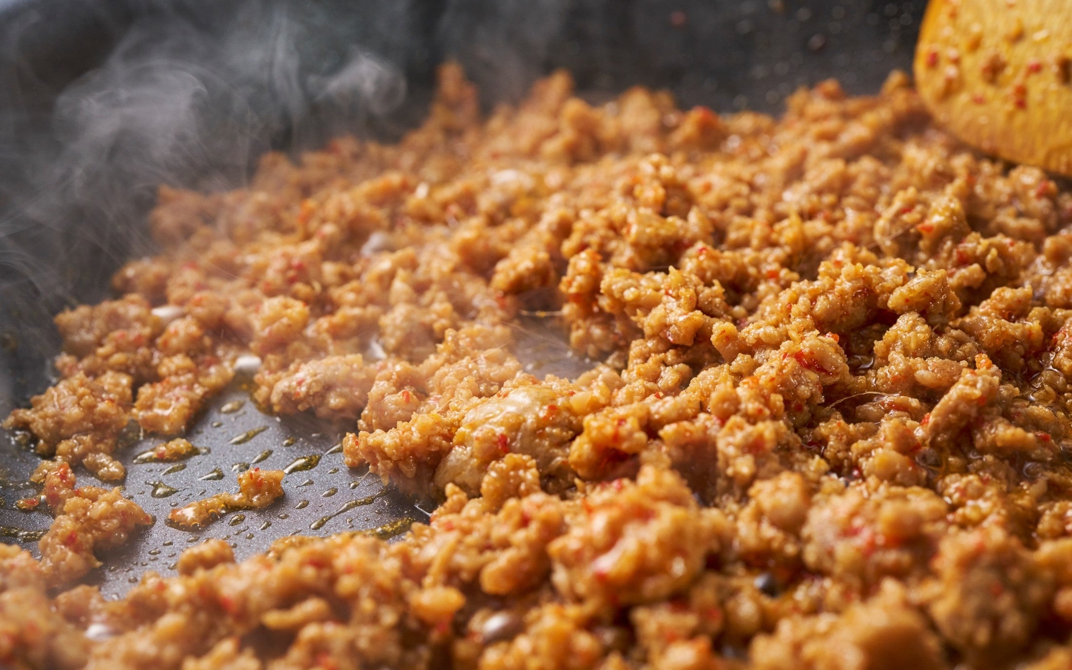 合わせ肉そぼろは、豚肉と鶏肉を合わせ甘辛く仕上げています。店内で焼き目がしっかり付くよう丁寧に火を入れるため、にんにくやしょうが、唐辛子それぞれの香りが引き立ちます。口に入れた際にジューシーな肉感や食感を感じるため、濃厚な担々スープや粉からつくる打ち立てうどんにも負けない味わいです。