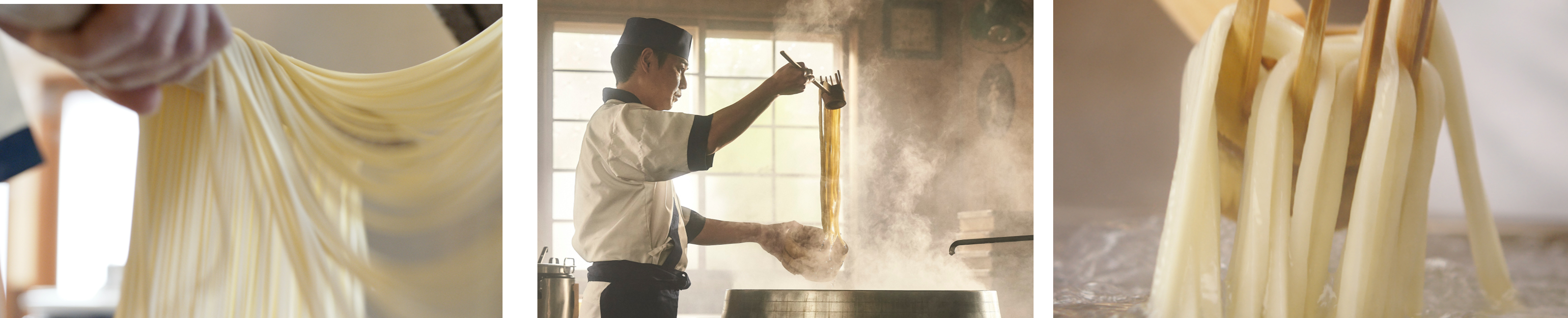 茹で釜から直接盛り付ける茹でたてでもちもち食感の「釜抜き麺」で提供するため、表面に毛羽立ちが残り、あさりの旨みたっぷりのだしがよく絡みます。すする度に磯の香りと旨みをご堪能いただけます。