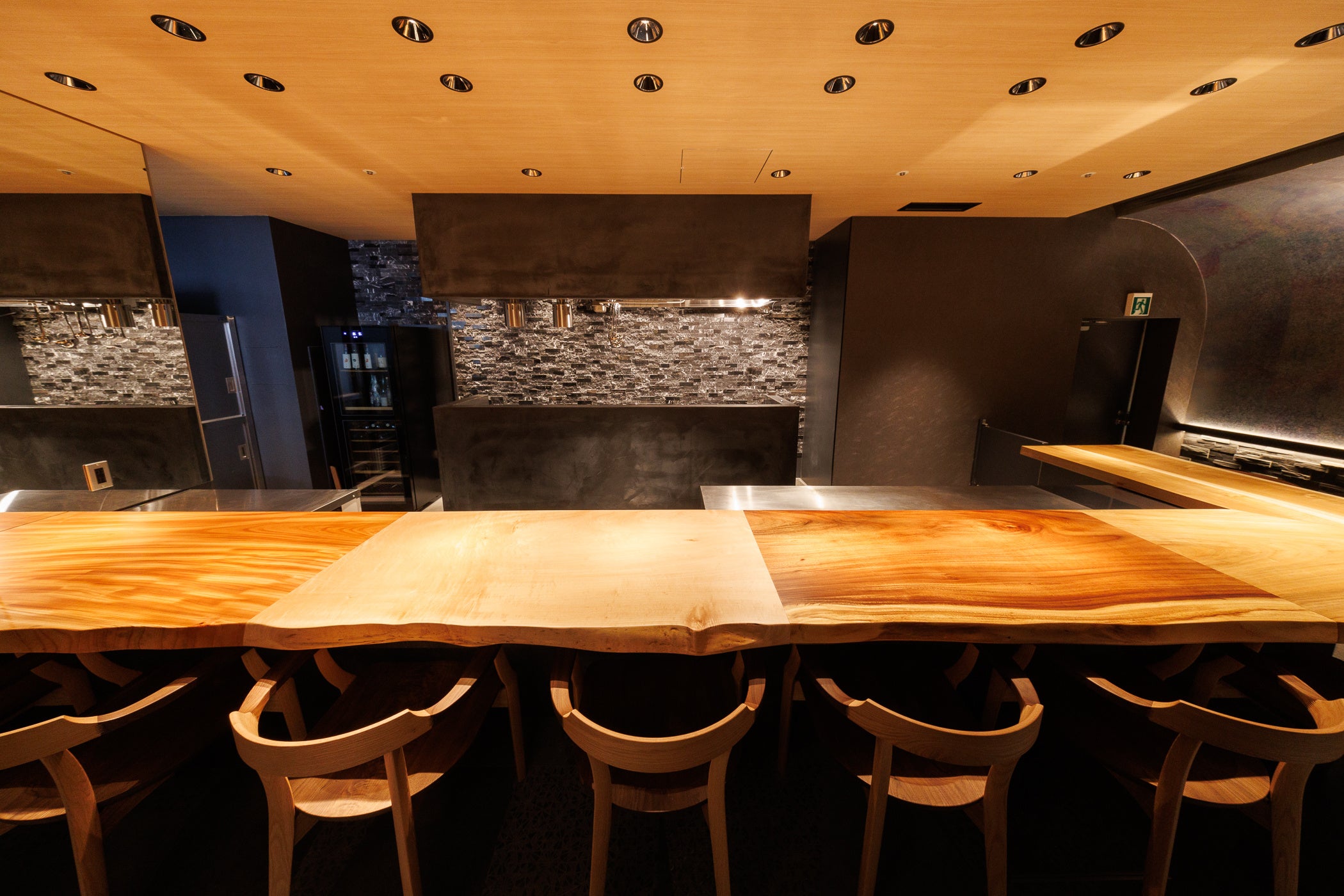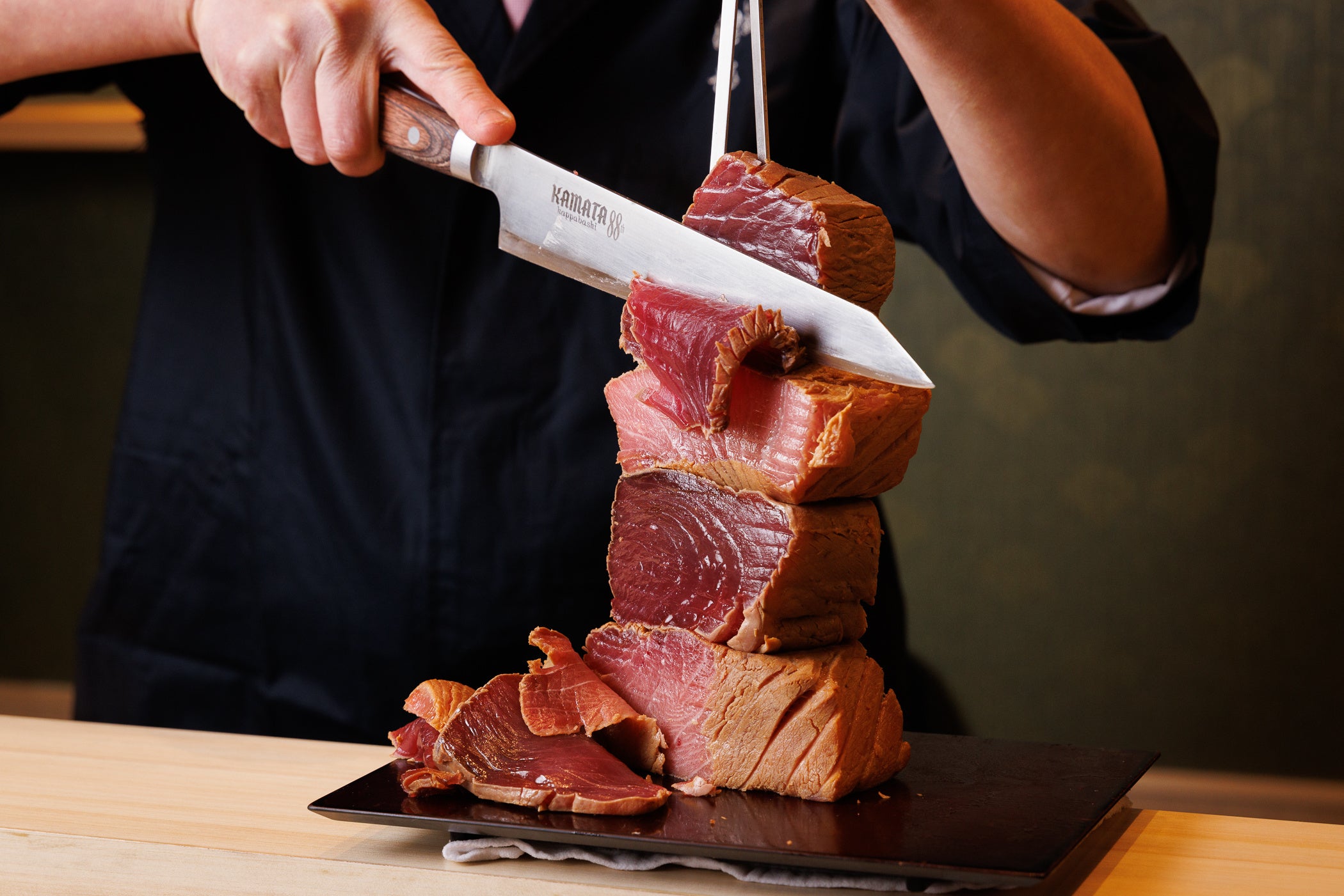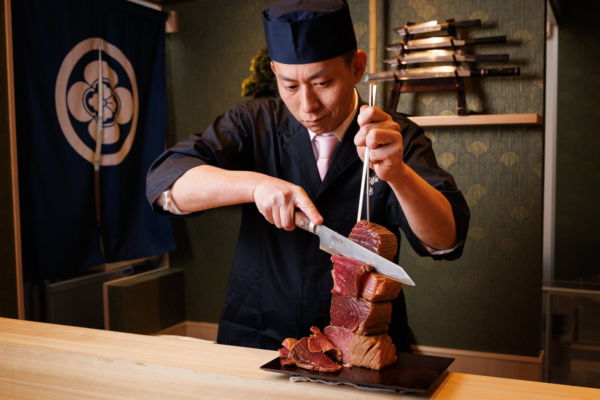 鮨屋の煮切醤油などで漬け込んだ生本マグロの赤身・中トロ・大トロなどの部位をお客様の目の前で、シュラスコスタイルで切り分け、断面が美しいミルフィール状の特製太巻きにして提供します。