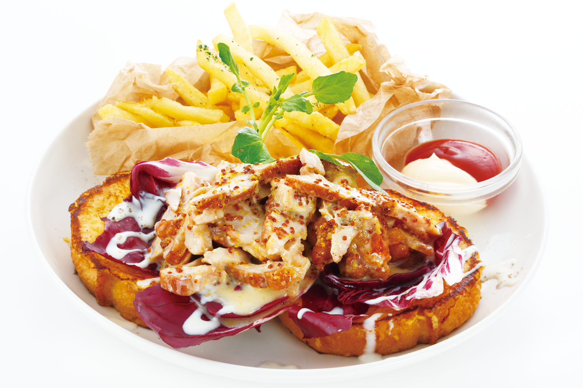 甘くないチーズのアパレイユ(卵液)で焼いたフレンチトーストに、自家製ハニーマスタードソースを絡めたチキンのせた、はちみつの甘さがクセになるミールメニューです。