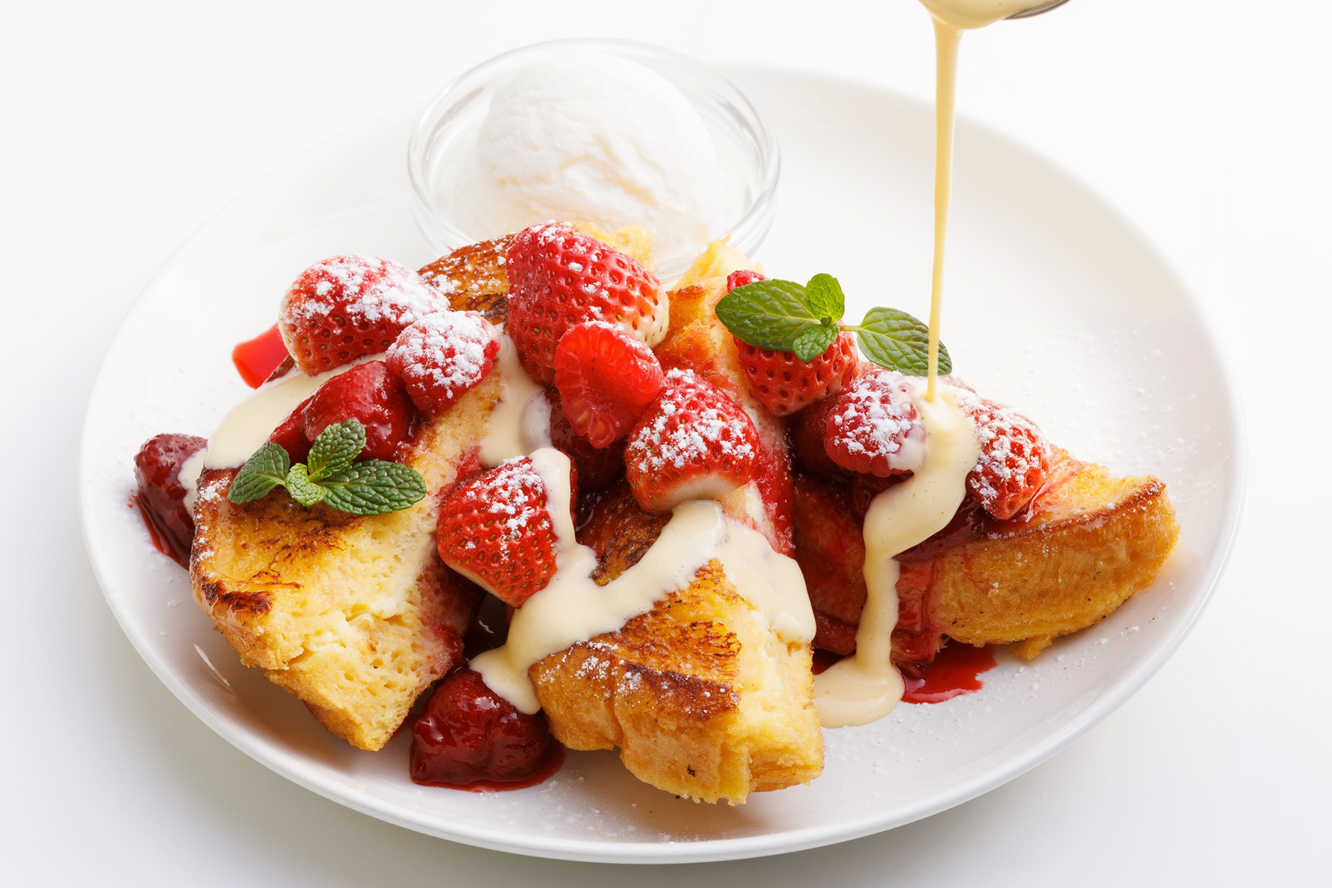 クリームチーズをサンドしたフレンチトーストに、ごろっとした苺の自家製ストロベリーソースをかけました。別添えのフランジェリコソースで味の変化も楽しんで。