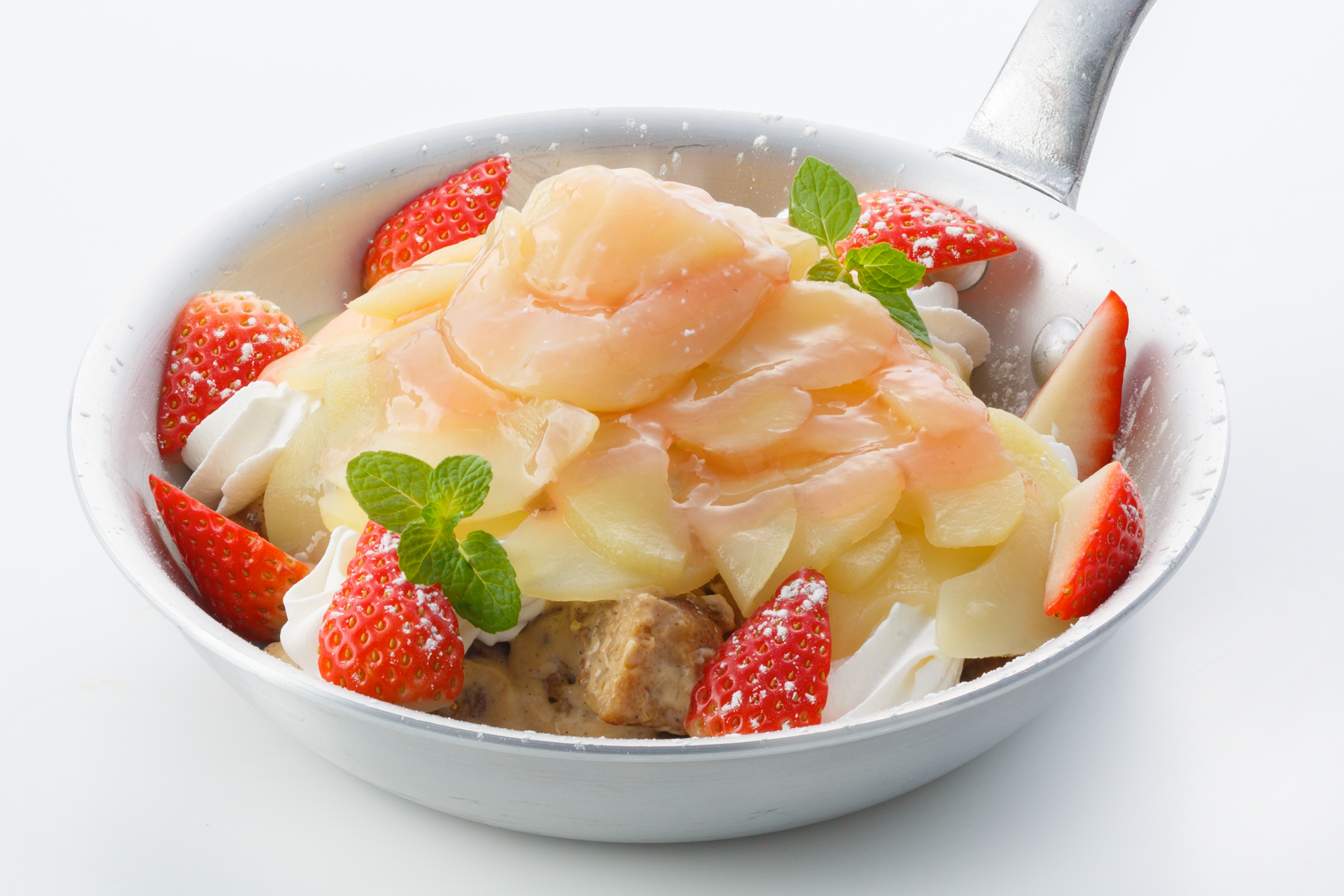 アールグレイアパレイユに浸し、焼き上げたフレンチトーストを紅茶風味のチーズプディングと絡め、スライスした白桃とストロベリーをトッピング。ピーチと紅茶がとっても爽やかなパンプディングです。