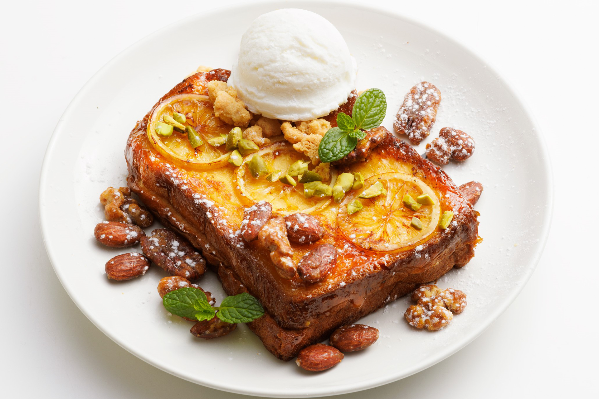 ブリオッシュのフレンチトーストで、レモンカスタードクリームをサンド。甘酸っぱいはちみつレモン、数種のナッツがアクセントになって、爽やかで食感の楽しい1皿。