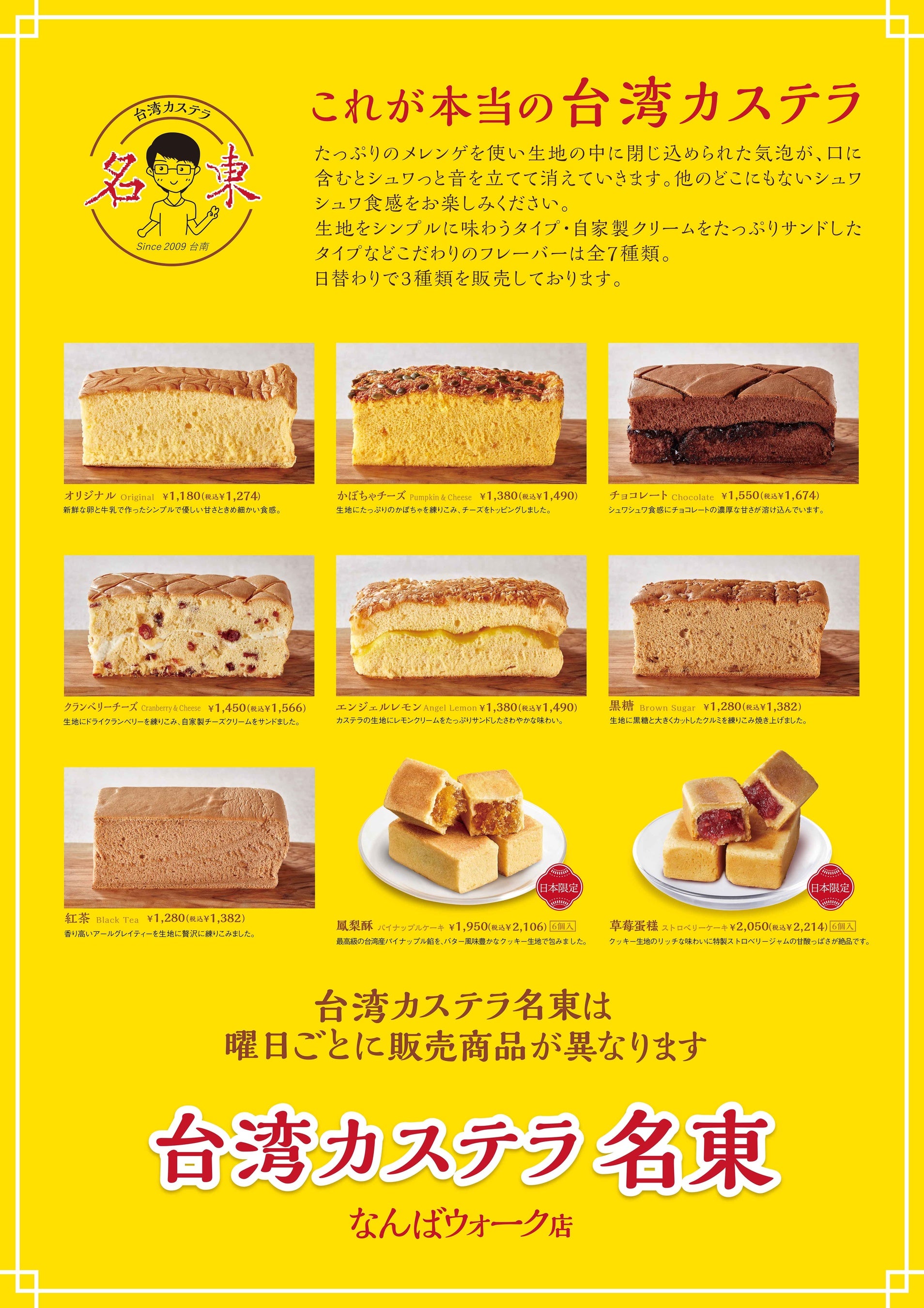 なんばウォークは約240店舗ものテナントが入っている複合商業施設であり、テナントはファッション、飲食、リラクゼーション、携帯電話ショップ、保険、クリニック、薬局など様々です。 不定期でワークショップや抽選会、イベントの催しがあり大阪南エリアにおいて様々な年代の方が日常的に利用する施設であり、関西の皆様に台湾カステラ名東の味を知って頂く上で最適であると考えております。