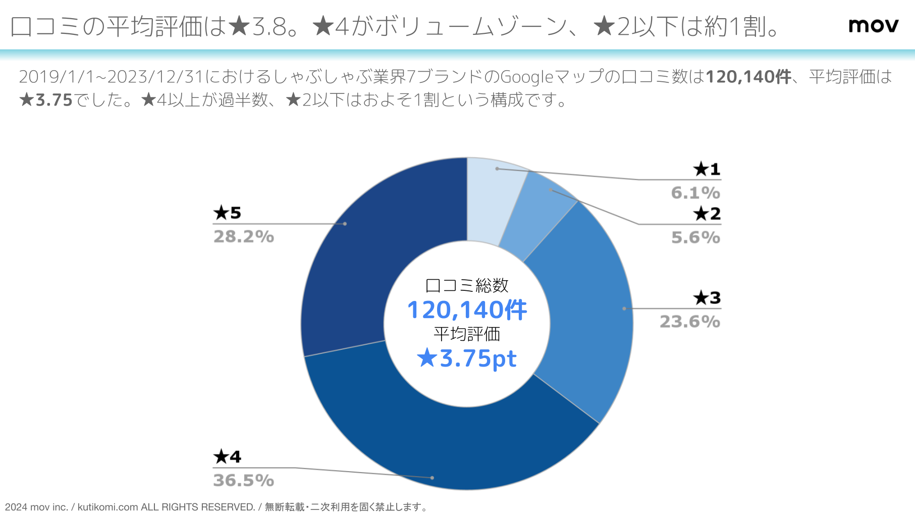 調査対象期間におけるしゃぶしゃぶ業界7ブランドのGoogleマップの口コミ数は120,140件、平均評価は★3.75でした。★4以上が過半数、★2以下は約1割という構成です。