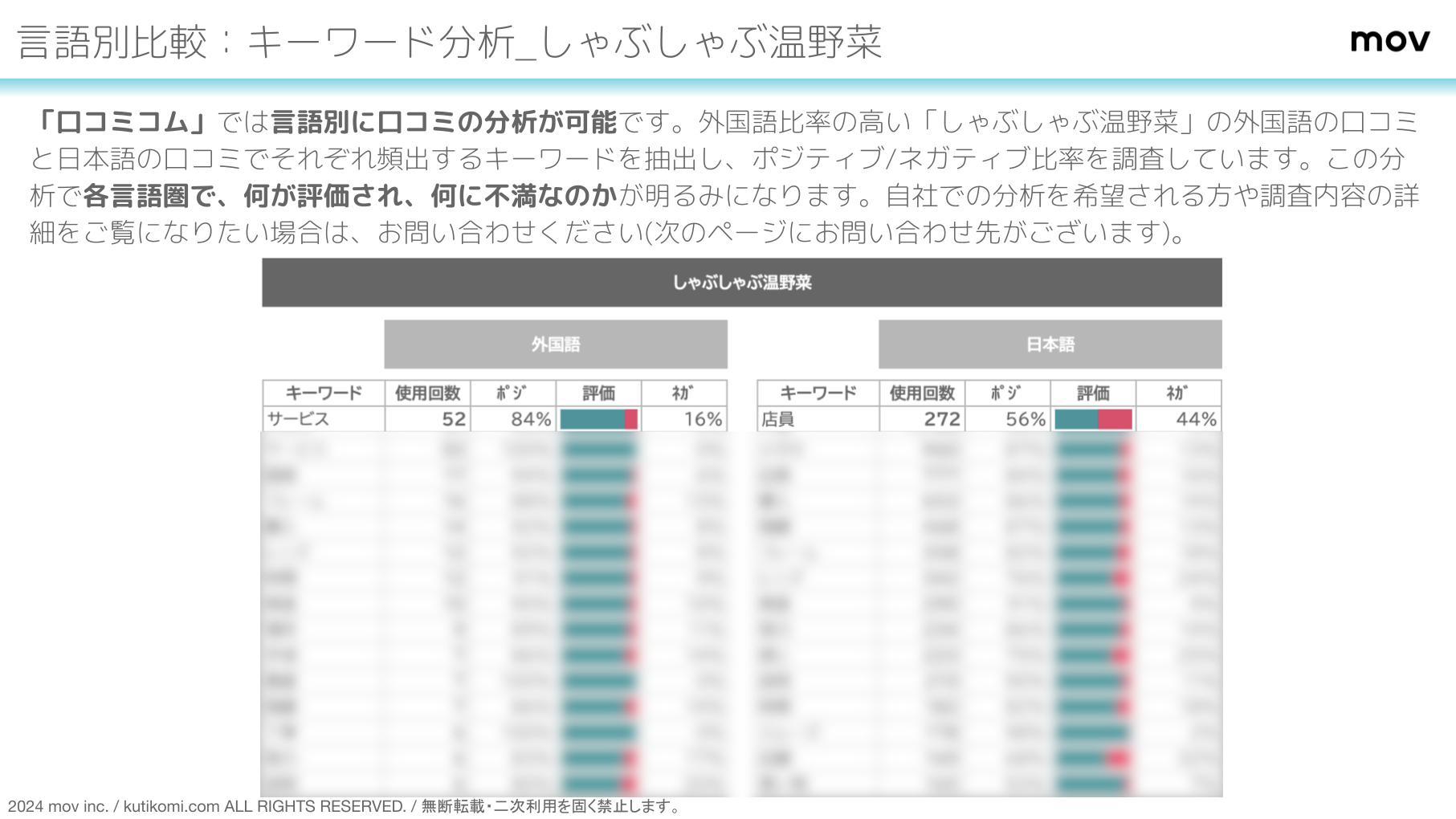 「口コミコム」では言語別に口コミの分析が可能です。各言語圏で、何が評価され、何に不満なのかが明るみになります。