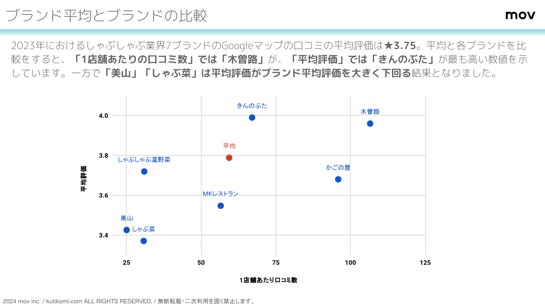 平均と各ブランドを比較をすると、「1店舗あたりの口コミ数」では「木曽路」が、「平均評価」では「きんのぶた」が最も高い数値を示しています。