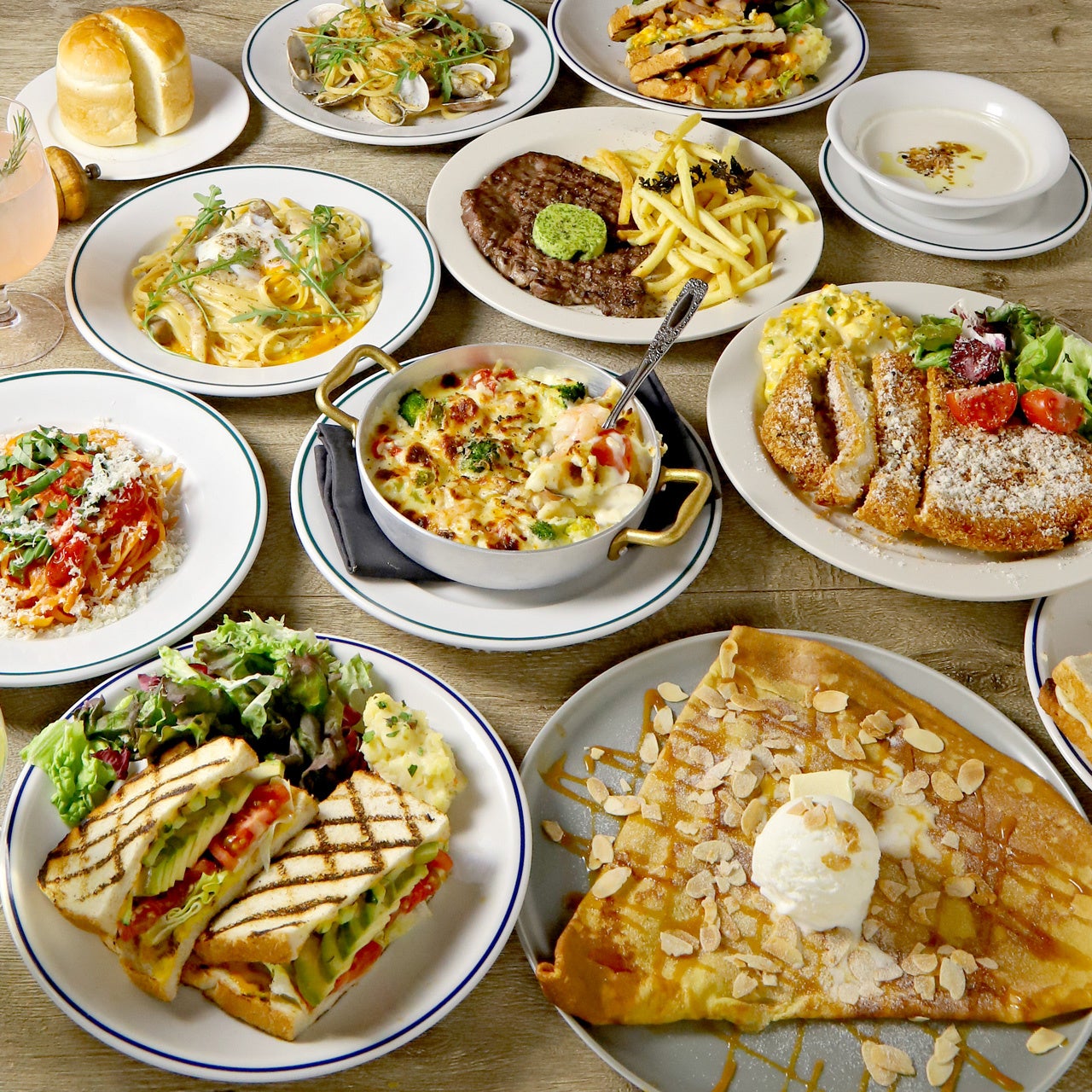 カジュアルに楽しめるサンドイッチ、こだわりのパスタ、ボリュームたっぷりなお肉料理がラインナップ。