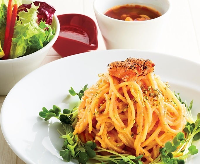 今回のフェアでは、明太子にわさび胡麻の風味が香る「たっぷり明太子の生パスタ」や、「やわらか牛ロースステーキ~柚子胡椒添え」のフード2品と、特製マスカルポーネクリームが自慢の「たっぷり苺のティラミスパンケーキ~練乳がけ」、白桃を使用した「白桃ミルクフラッペ」など、春を感じるカフェメニューをご用意しました。