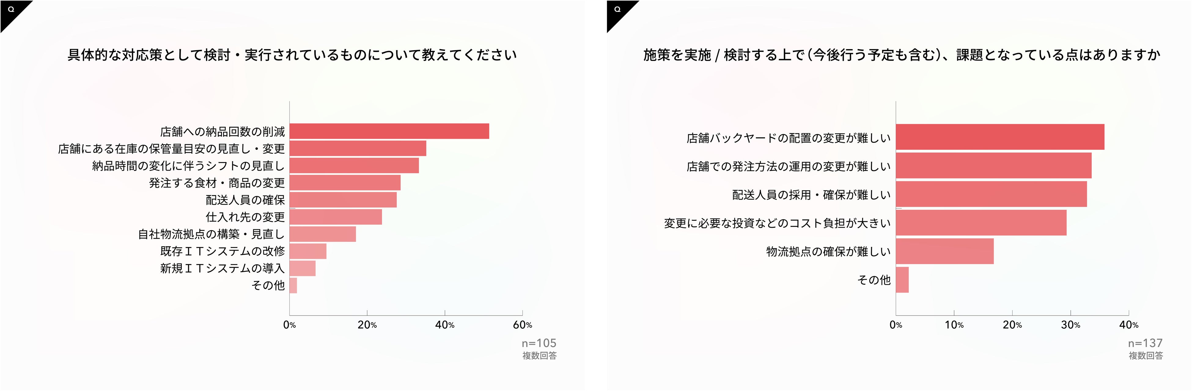 影響があると想定される業務への対策は「店舗への納品回数の削減」、「店舗にある在庫の保管量目安の見直し・変更」などさまざまだが、「店舗での発注方法の運用の変更が難しい」「店舗バックヤードの配置の変更が難しい」など実行・検討への課題が多いこともわかった。