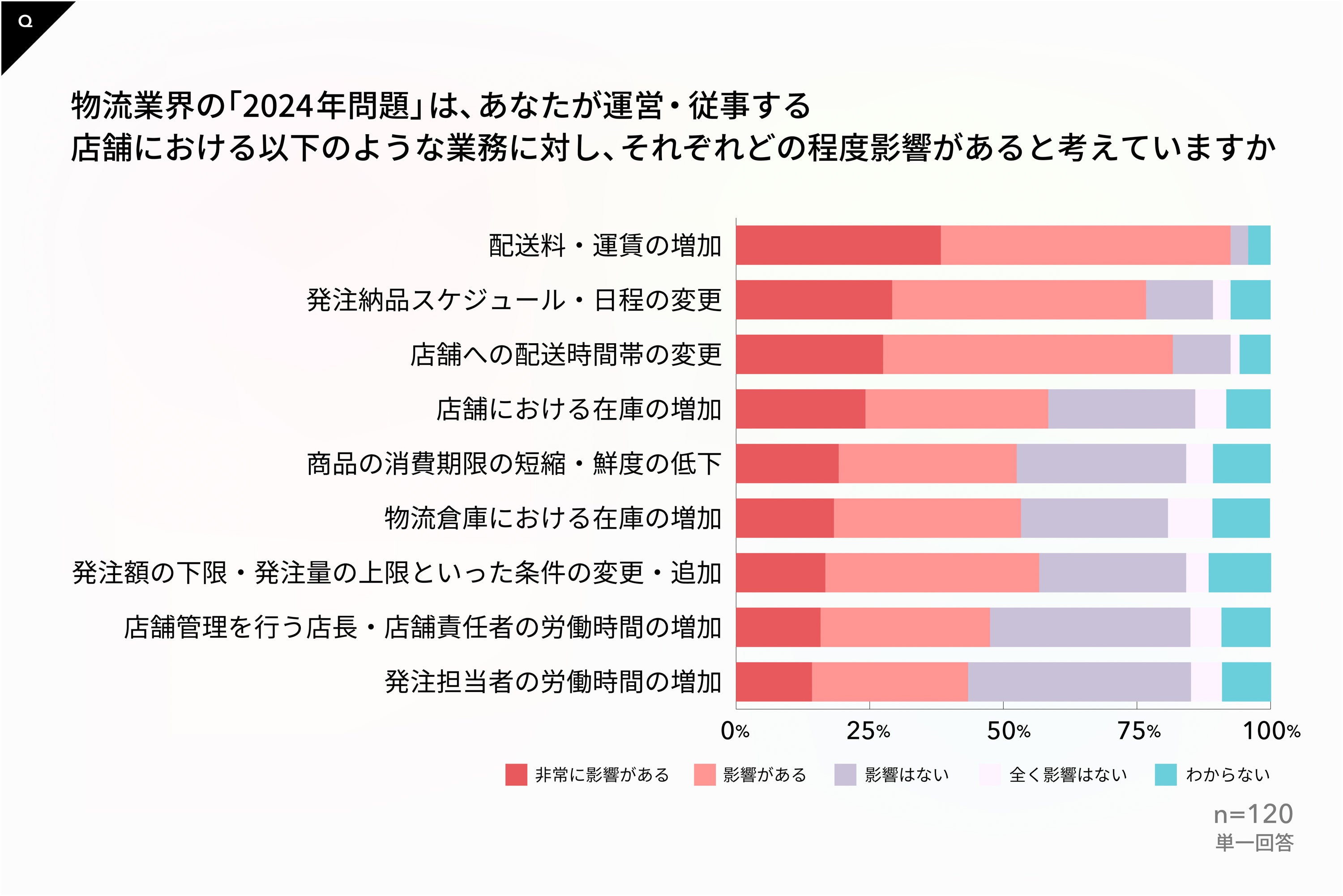 具体的に影響があるのは、コスト(配送料・運賃の増加)、仕入れスケジュールの変更(店舗への配送時間帯の変更、発注納品スケジュール・日程の変更)があげられた
